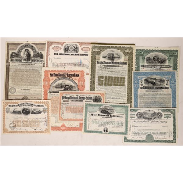 Railroad stock certificates (5) and bonds (5). Railroads included are Erie-Lackawanna, Pennsylvania Railroad, New York Central & Hudson, Michiga...