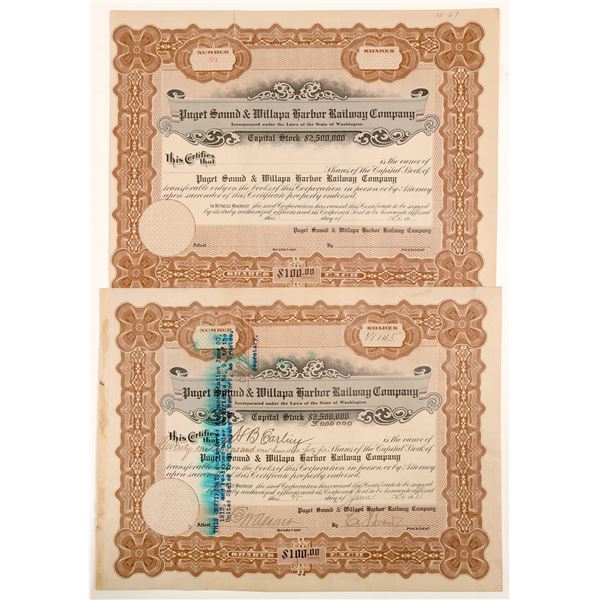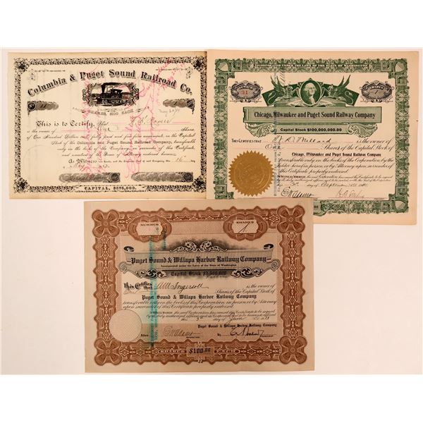 Three stock certs include The Columbia & Puget Sound RR, Chicago, Milwaukee & Puget Sound Ry and The Puget Sound& Millapa Valley RR Co. ...