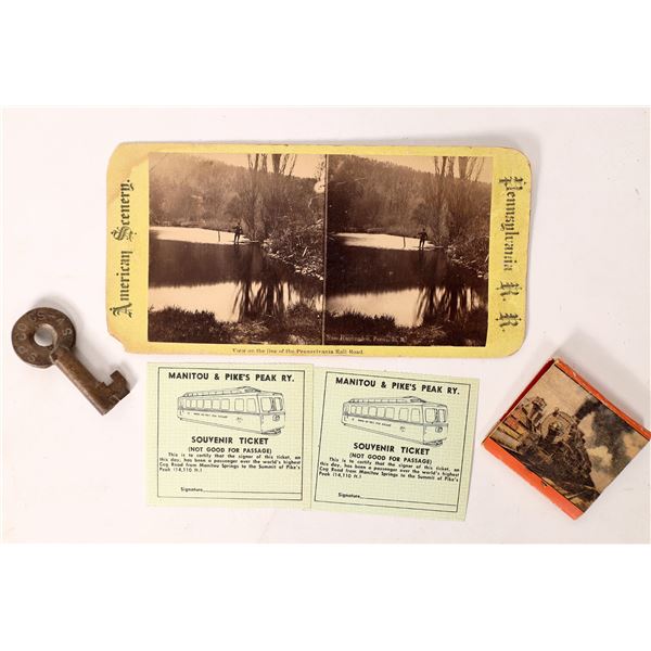 Includes a Southern Pacific Adlake key, a book of matches from Litchfield Madison Railway, a souvenir ticket from The Pikes Peak RWY and a stereo view