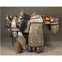 MacPherson Saddle (Burbank, CA) Fully silver mounted, extraordinary parade saddle. Featuring Ram design conchos. Includes matching serape, crupper, br