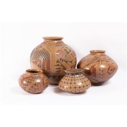 Group of Four Mata Ortiz Pots 1) 12" x 12". Signed on bottom: Miguel Bugarini. 2) 9" x 11". Signed on bottom: Felix Ortiz. 3) 5&...