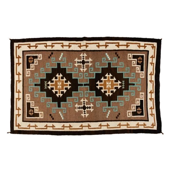 57" x 38". Tightly woven Two Grey Hills weaving featuring two central stepped designs and a serrated and stepped border. Circa ...