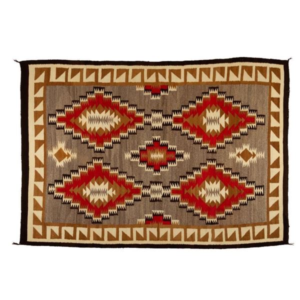 66" x 47". Ganado area weaving with varying diamond and stepped designs. Circa 1940.