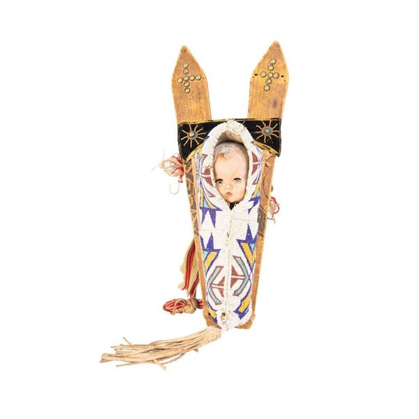 Cradle is 18" overall with 7" of fringe. Beaded in loom style with geometric designs. Cradleboards are de...