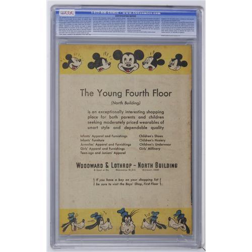 This is the only copy certified with a grade above 8.5 by CGC as of this writing. Like other Crippen copies of this promotional series, this one has the imprint of the Woodward & Lothrop department store located in Washington D.C. where Davis Crippen grew up. Overstreet 2006 NM- 9.2 value = $420. CGC census 12/06: 1 in 9.2, none higher. <I>From the Crippen Collection.</B></I><BR><BR><b>Shipping:</b> Slabbed Comic (<a target="_blank" href="http://www.heritageauctions.com/common/shipping.php">view shipping information</a>)