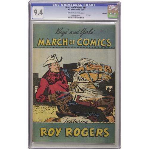 <B>March of Comics #68 Roy Rogers - File Copy (K. K. Publications, Inc., 1951) CGC NM 9.4 Off-white to white pages.</B></I> No other copy of this issue has garnered a grade higher than VF 8.0 from CGC to date. Overstreet 2006 NM- 9.2 value = $220. CGC census 12/06: 1 in 9.4, none higher.<BR><BR><b>Shipping:</b> Slabbed Comic (<a target="_blank" href="http://www.heritageauctions.com/common/shipping.php">view shipping information</a>)