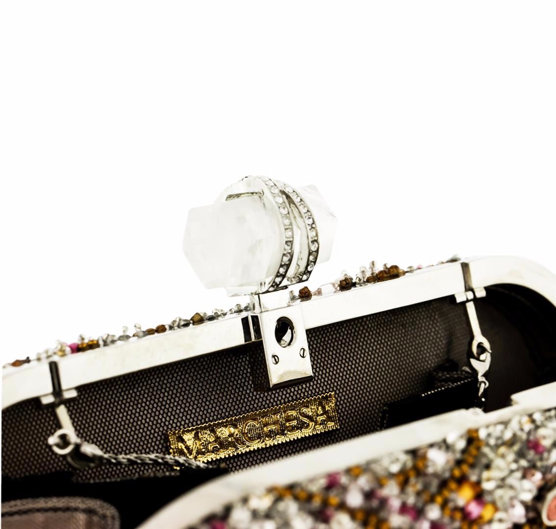 One Marchessa Multicolor Lily Embroidered Crystal Clutch. Carry all your evening essentials in this stunning crystal-embellished tote topped with a quartz crystal clasp. Estimated retail value $3,295.00.