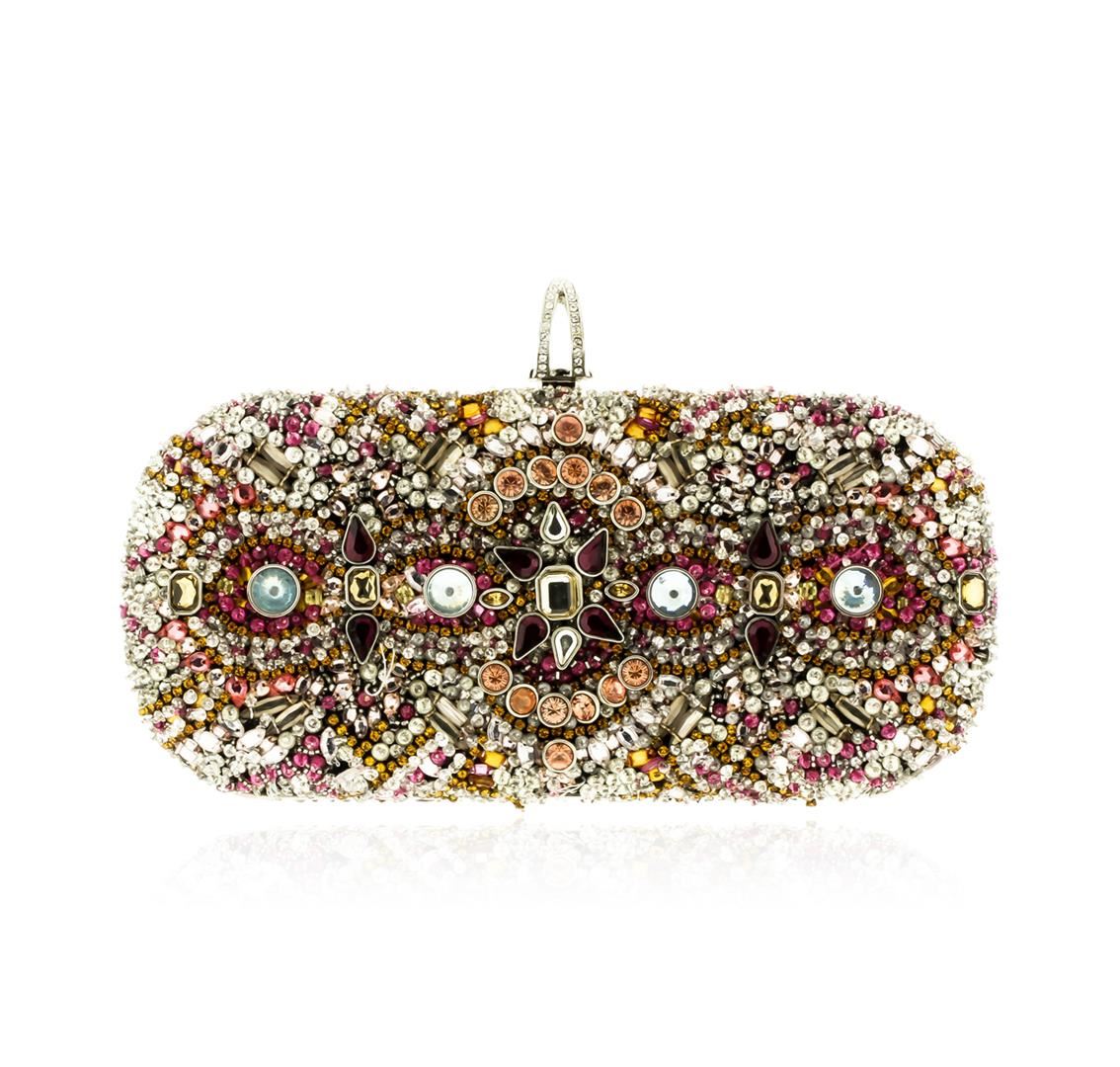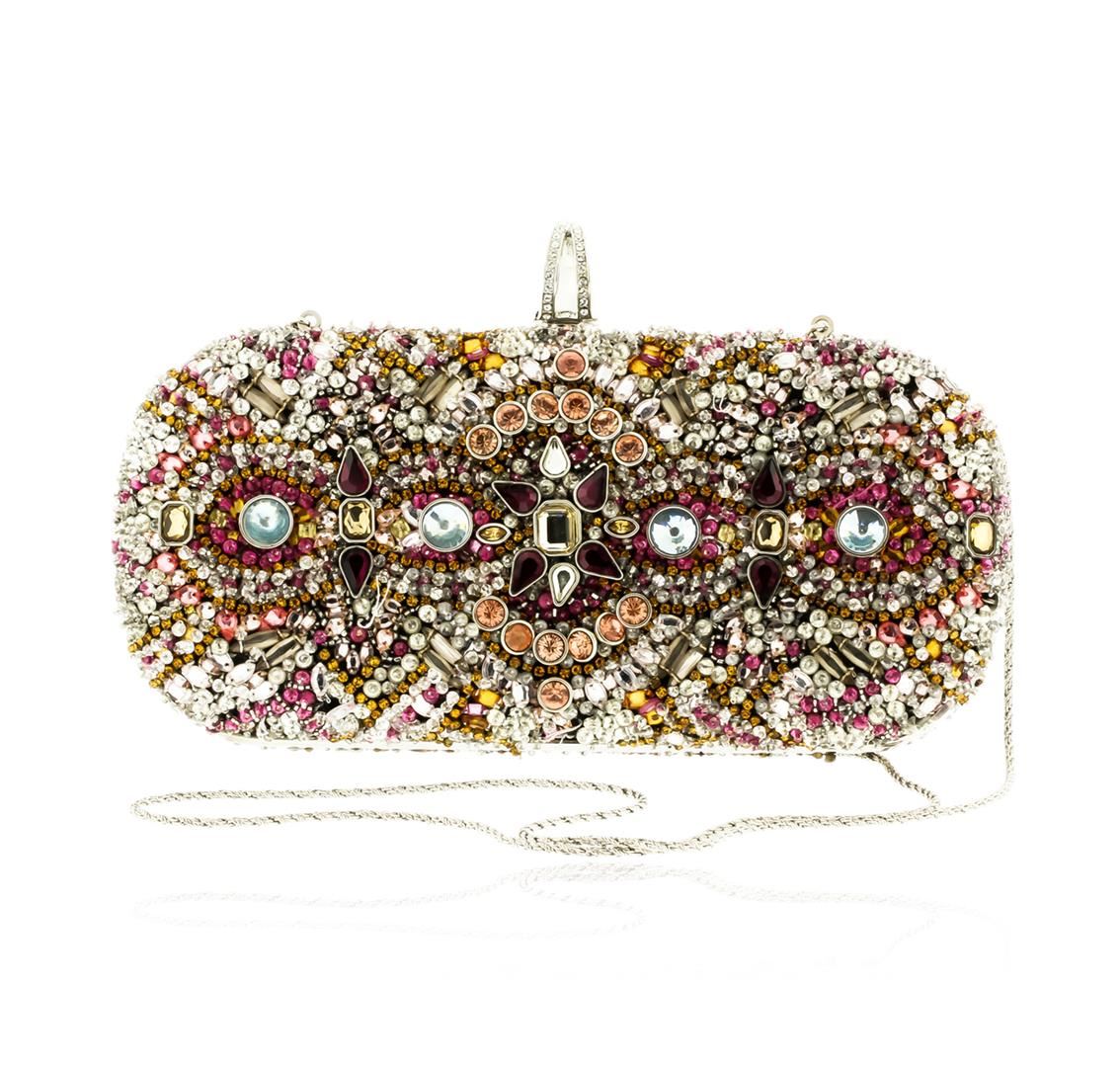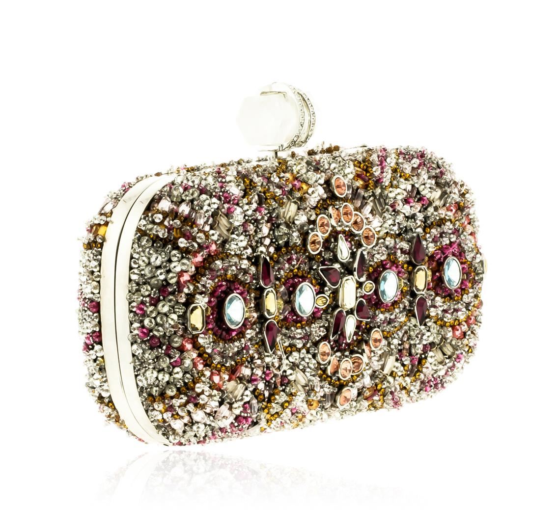 One Marchessa Multicolor Lily Embroidered Crystal Clutch. Carry all your evening essentials in this stunning crystal-embellished tote topped with a quartz crystal clasp. Estimated retail value $3,295.00.