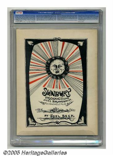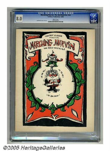 <B>Marching Marvin the Red Watcher #nn (Sunbury Productions, 1966) CGC VF 8.0 White pages.</B></I> Joel Beck's second comic (after <B>Lenny of Laredo</B></I> in 1965), produced as a college comic book. Beck's early books like this are considered forerunners to the Underground Comix movement that began in earnest with the publication of <B>Zap Comix</B></I> a year after <B>Marching Marvin</B></I>. This first printing copy is rare and very desirable. NOTE: there is a very small crack in the CGC holder on the upper right side, near the hologram sticker. CGC census, 3/05: 1 8.0, none higher.