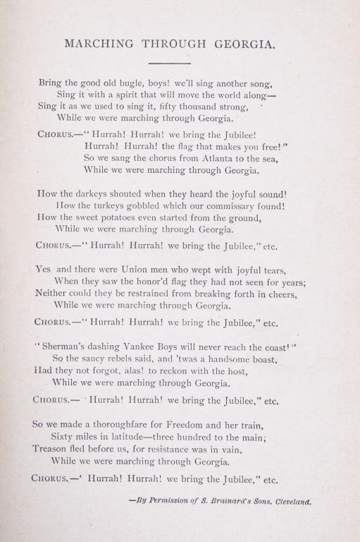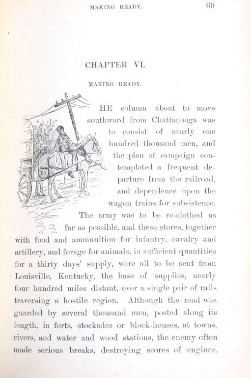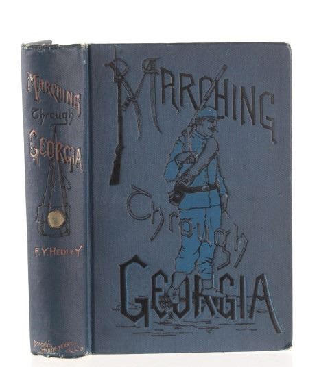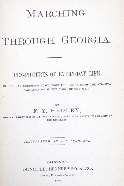 Featured in this lot is this 1890 edition of “Marching Through Georgia” by F.Y. Hedley. The book was written by Hedley, who was adjutant of the 32nd Illinois Infantry and Member of the Society of the Army of the Tennessee, and illustrated by F.L. Stoddard. “Marching through Georgia” covers the years 1862-1865 with information on battles at Forts Henry and Donnelson, Shiloh, Vicksburg, and Chattanooga before getting into the march through Georgia. The book is a memoir of day-to-day life in the army, providing detailed descriptions of how the army was supplied, the construction of corduroy roads, and the destruction of rail lines, rather than acting as a tactical history of the campaign. The book includes 28 illustrated plates and numerous in text illustrations. The book has a blue cloth covering with gold and black gilt lettering and decorations on the cover and spine. The condition of this book is very good, with slight wear to the outside cover and browning to the pages consistent with the age of the book. The measurements of this book are 8" x 5 3/4".