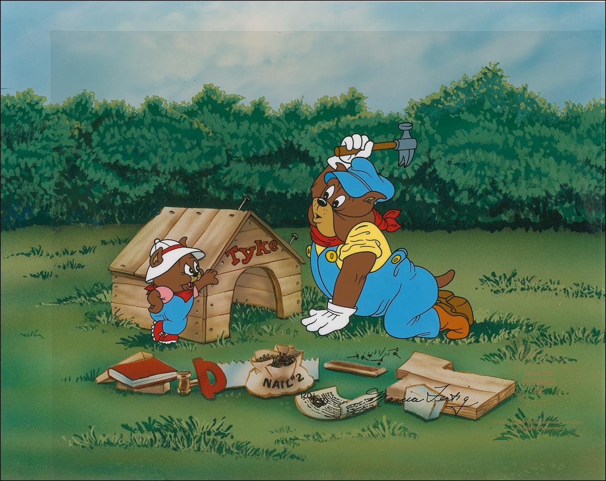 Limited edition hand-painted animation cel, titled ‘Spike ’n’ Tyke,’ numbered 120/250, 12 x 9, showing Spike and Tyke building a doghouse, signed in black felt tip by Fertig and set against a pre-printed satin-finish color background. In fine condition.