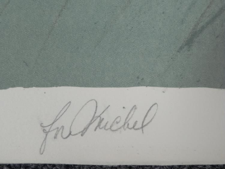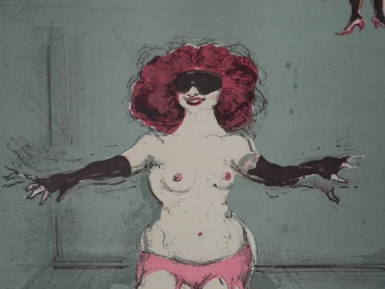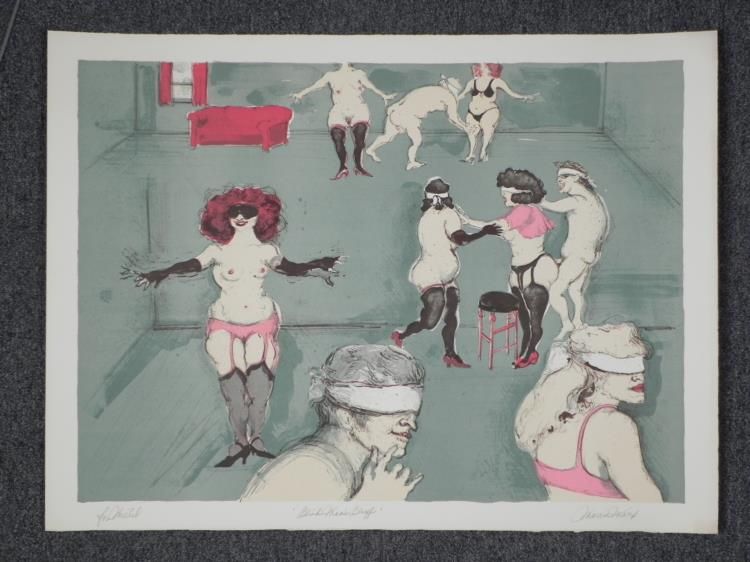 This favorite children's game looks quite kinky being played by these blind-folded, scantily-clad adults. Artist: Marcia Marx Signature: In pencil, lower right Title: Blind Man's Bluff Medium: Lithograph on Rives paper Edition: Unnumbered, dedicated artist proof, marked "For Michel" lower left Year: 1975 Sheet size: 22 x 30 inches Publisher: Bank Street Atelier, with blind stamp lower right corner Condition: Excellent Biography:Marcia Marx (1931-2005) was an artist, sculptor, and visual satirist with an eye for the absurd. She studied art at Yale University and Columbia University, and they moved to Mexico City where she painted for more than a decade. Here later years were spent in Israel, Paris and Rome. She was the first woman to hold a solo show at the Instituto Nacional de Bellas Artes, which was quite successful. Two of her other notable exhibitions include a retrospective of her art at the Mexican Cultural Institute of New York, and a solo show titled "An Interpretation of the Holocaust" at the Houston Holocaust Museum. Today her artwork is part of many public and private collections around the world. We are pleased to present from an estate a group of dedicated artist proofs.