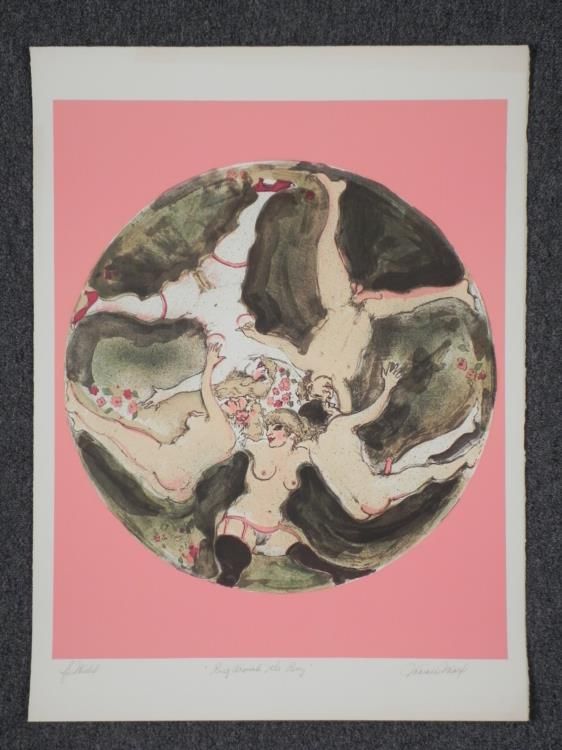 This Ring Around the Rosy is not the traditional game, as there is no "pocket full of posy," since these mostly nude figures don't even have pockets! Artist: Marcia Marx Signature: In pencil, lower right Title: Ring Around the Rosy Medium: Lithograph on Rives paper Edition: Unnumbered, dedicated artist proof, marked "For Michel" lower left Year: 1975 Sheet size: 22 x 30 inches Publisher: Bank Street Atelier, with blind stamp lower right corner Condition: Excellent Biography:Marcia Marx (1931-2005) was an artist, sculptor, and visual satirist with an eye for the absurd. She studied art at Yale University and Columbia University, and they moved to Mexico City where she painted for more than a decade. Here later years were spent in Israel, Paris and Rome. She was the first woman to hold a solo show at the Instituto Nacional de Bellas Artes, which was quite successful. Two of her other notable exhibitions include a retrospective of her art at the Mexican Cultural Institute of New York, and a solo show titled "An Interpretation of the Holocaust" at the Houston Holocaust Museum. Today her artwork is part of many public and private collections around the world. We are pleased to present from an estate a group of dedicated artist proofs.