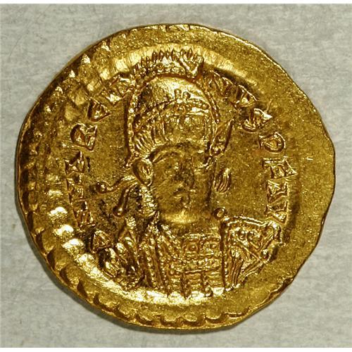 <B>Marcian.</B></I> A.D. 450-457. AV solidus (21 mm, 4.48 g). Constantinople. Diademed, helmeted and cuirassed bust facing slightly right, holding spear over shoulder shield decorated with a horseman spearing fallen enemy / Victory standing left, holding long jewelled cross; star in right field; S/CONOB. RIC 510; Depeyrot 87/1. <B>Good VF,</B></I> central striking weakness.<BR><BR><b>Shipping:</b> Coin/Currency (<a target="_blank" href="http://www.heritageauctions.com/common/shipping.php">view shipping information</a>)