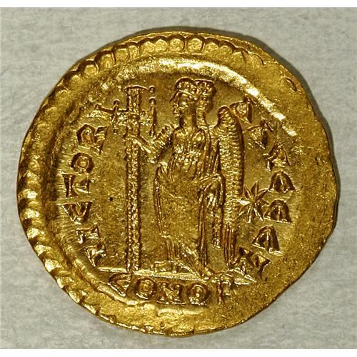 <B>Marcian.</B></I> A.D. 450-457. AV solidus (21 mm, 4.48 g). Constantinople. Diademed, helmeted and cuirassed bust facing slightly right, holding spear over shoulder shield decorated with a horseman spearing fallen enemy / Victory standing left, holding long jewelled cross; star in right field; S/CONOB. RIC 510; Depeyrot 87/1. <B>Good VF,</B></I> central striking weakness.<BR><BR><b>Shipping:</b> Coin/Currency (<a target="_blank" href="http://www.heritageauctions.com/common/shipping.php">view shipping information</a>)