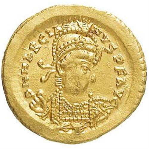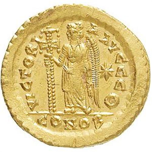 Roman Empire Coins. Marciano (450-457). Solido, Constantinople. D/ DN MARCIANVS PF AVG. Busto armato, stante tre quarti a destra. R/ VICTORIA AVGGG T. La Vittoria, stante a sinistra, tiene lunga croce. Nel campo a destra, stella. In esergo: CONOB. Cfr. LRC 477-484 var. (manca officina T). gr. 4.49 R. AU. Circoscritta debolezza di conio al centro del D/, altrimenti SPL.