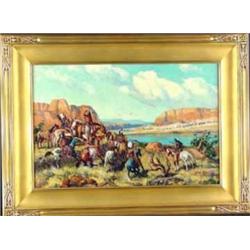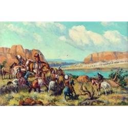 Marco Antonio Gomez (1910-1972) (Arizona). Oil On Canvas. "The Enemy (Custer And The 7th Cavalry.)" 20" x 30". signed lower right & Verso. Est $5,000 - $7,000.