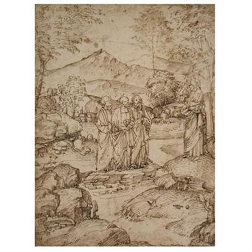 Notes:Drawings by Italian Masters of the XV-XVIII Centuries. From a selection of 40 facsimiles of the originals preserved in the Albertina Collection in Vienna. With an introduction and descriptive text by Joseph Meder, Late Director of the Albertina and edited in English Campbell Dodgson, M.A, C.B.E, Kepper of prints and drawings at the Britich Museum. Published in London by BT Batsford Ltd, 94, High Holborn in 1930. The edition for the British Empire and the United States of America is limited to 125 copies. All rights of this work are the property of Anton Schroll & Co who are publishers of the German Edition. Printed in Austria. Plate #32 "Christ Taking Leave of the Disciples Peter, James, and John" (Mark XIV. 33). In the foreground the stony wilderness of the Mount of Olives, in the background a building and soaring hills. Formerly attributed to Giovanni Bellini. The original was done in pen and ink on paper that has turned yellow.