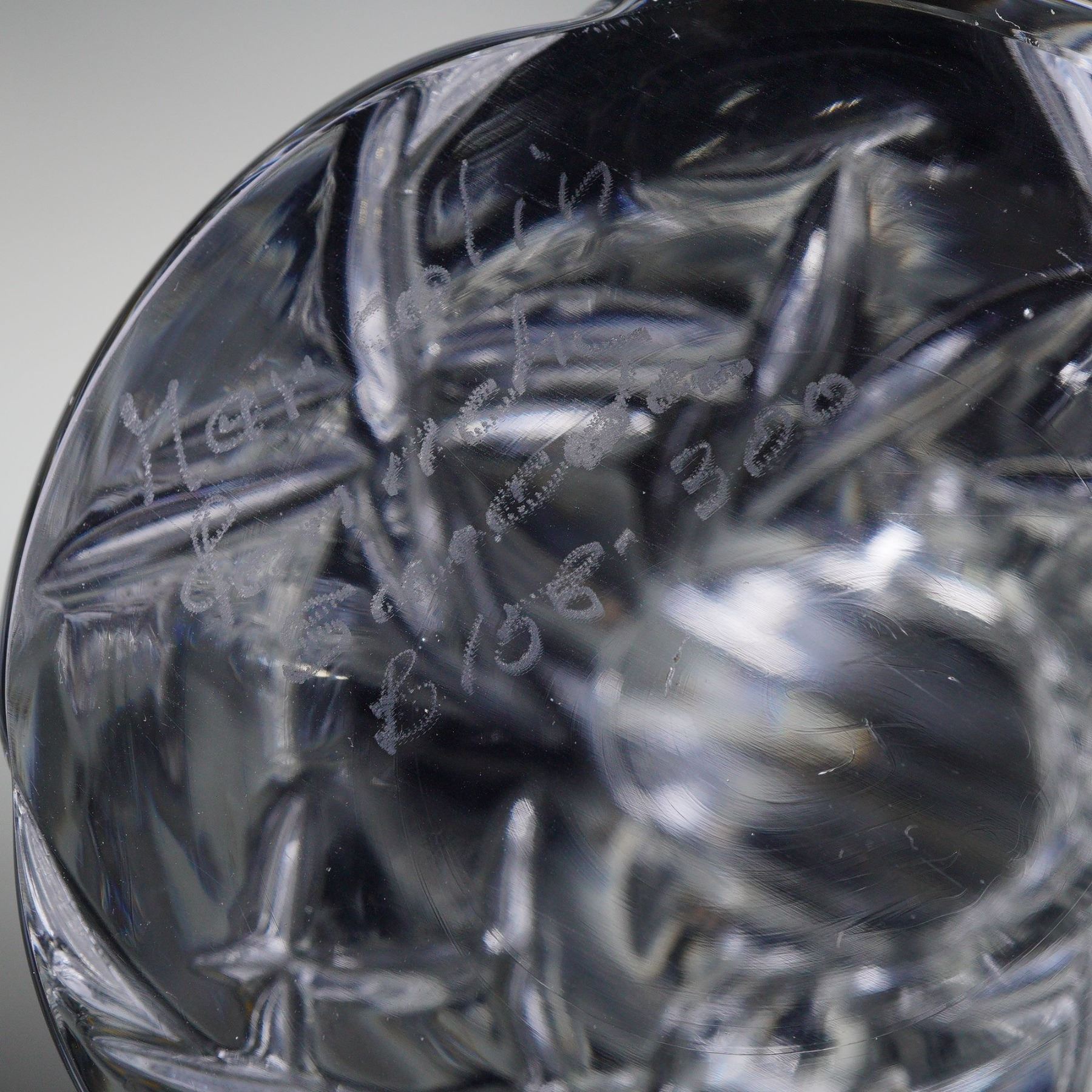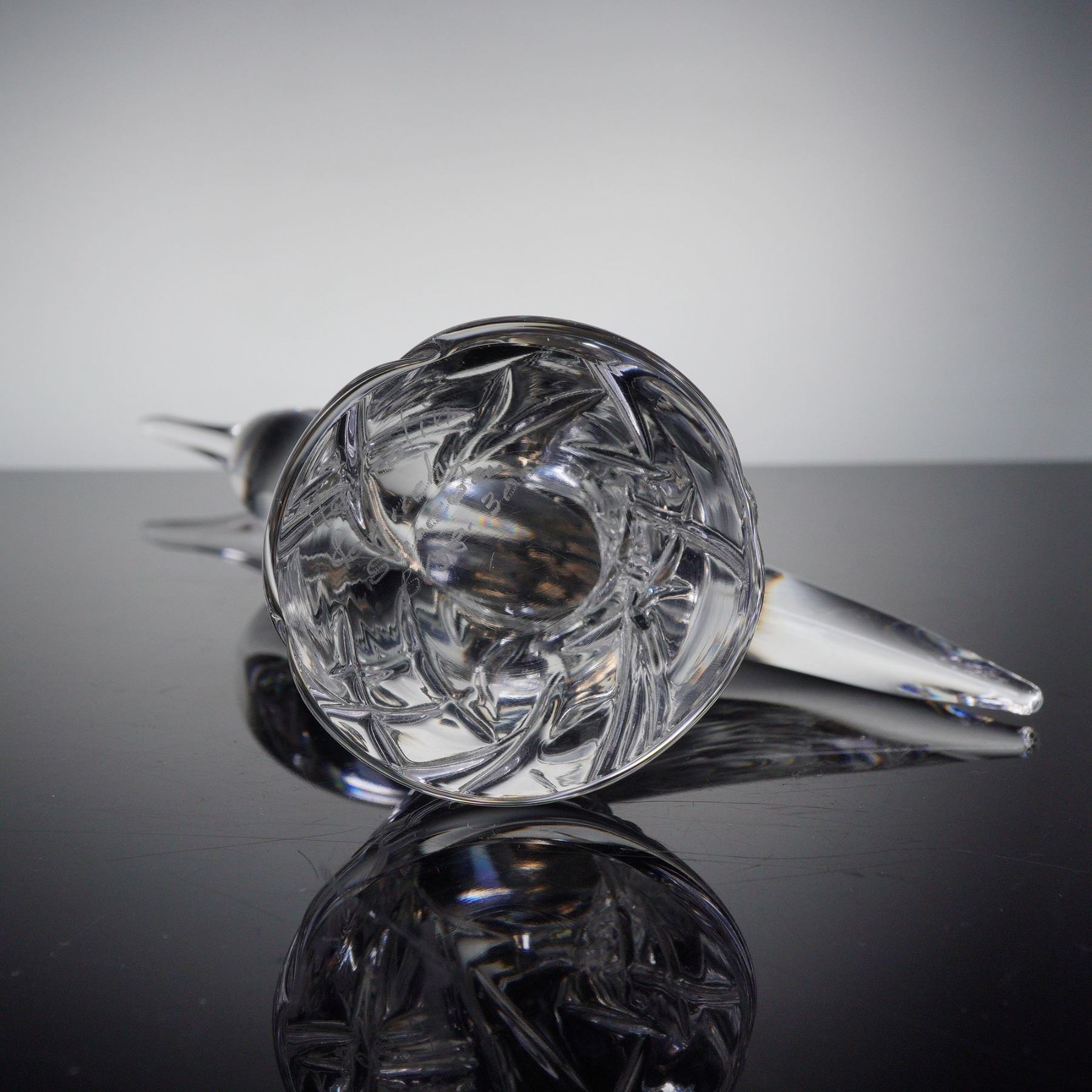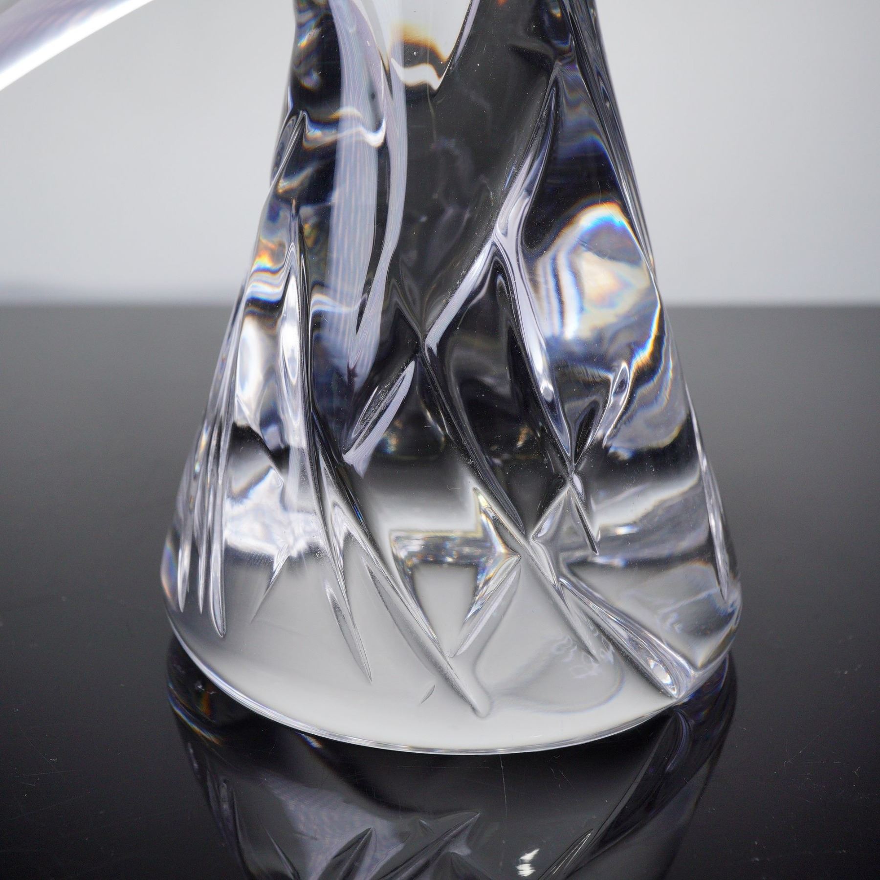 Elegant glass sculpture depicting a tall heron rendered in clear crystal with graceful contours and a sculpted base featuring faceted textural detailing. Expertly handcrafted in Sweden, this refined piece captures the fluidity and poise of the heron with minimalist Scandinavian artistry. The sculpture is signed Marcolin Ronneby Sweden, numbered B105/300.