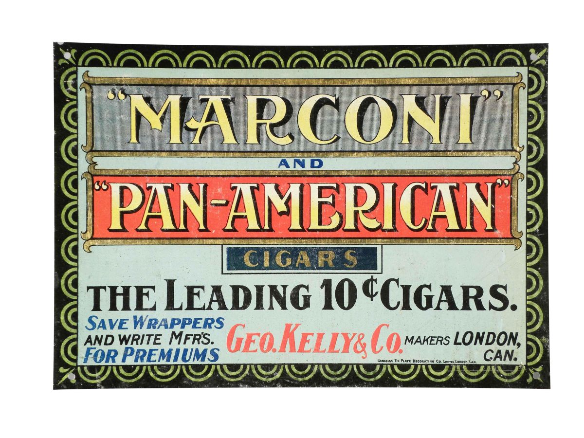 Marconi and Pan American Cigars/Dargai Cigars two sided tin sign. London, Ont. Mfg. by Geo. Kelly & Company. Very good condition. 9 1/2 X 6 1/2 inches.
