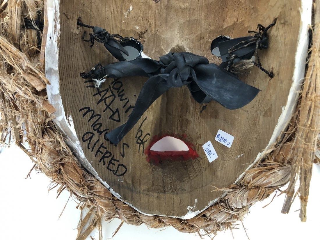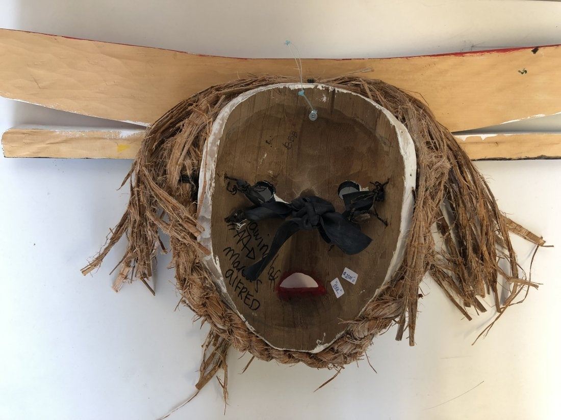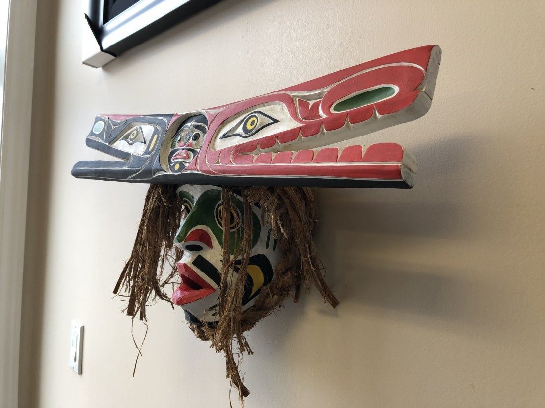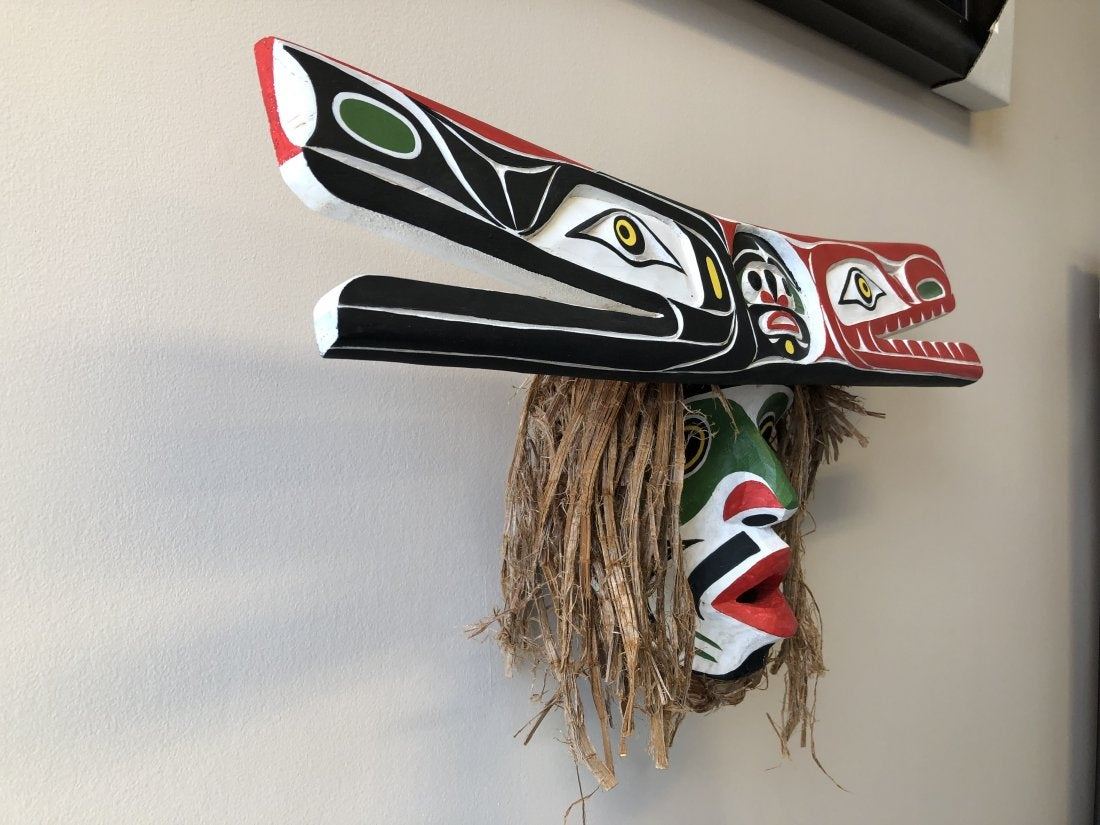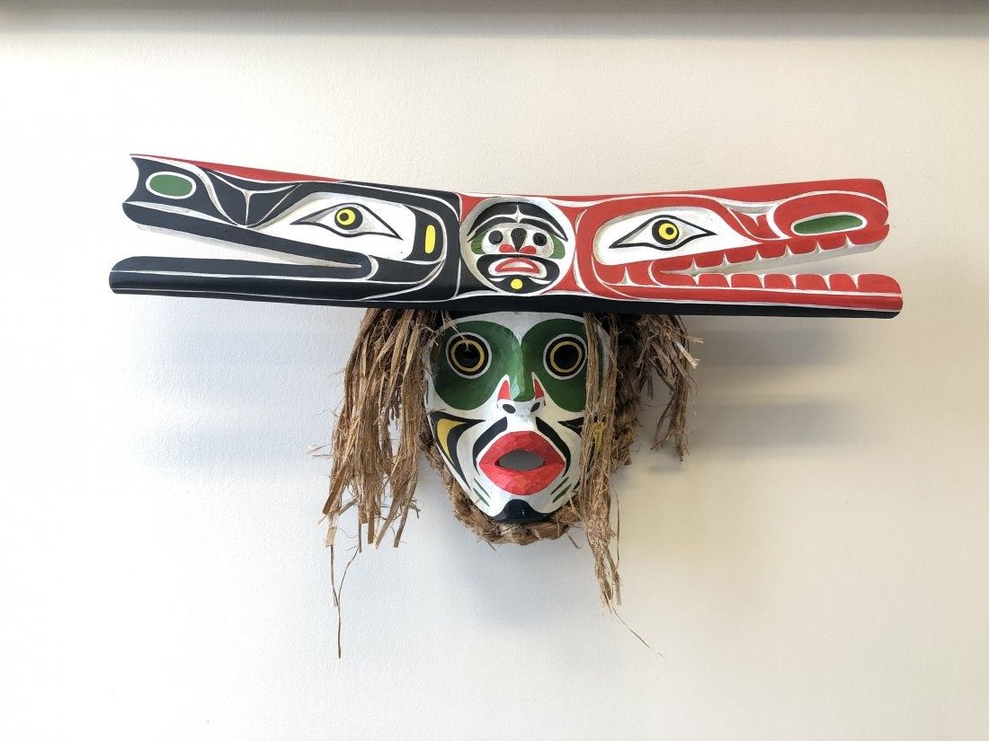 Marcus Alfred's "Hawinalat" original wooden carved mask. Carved in 2016, from the Kwakwaka'wakw Nation, Vancouver Island. This mask is white, green, yellow, black and red, and made of yellow cedar. Valued between $4,800 - $5,000 in 2019. This mask is in excellent condition. 12" x 5 1/2" x 23 3/4"