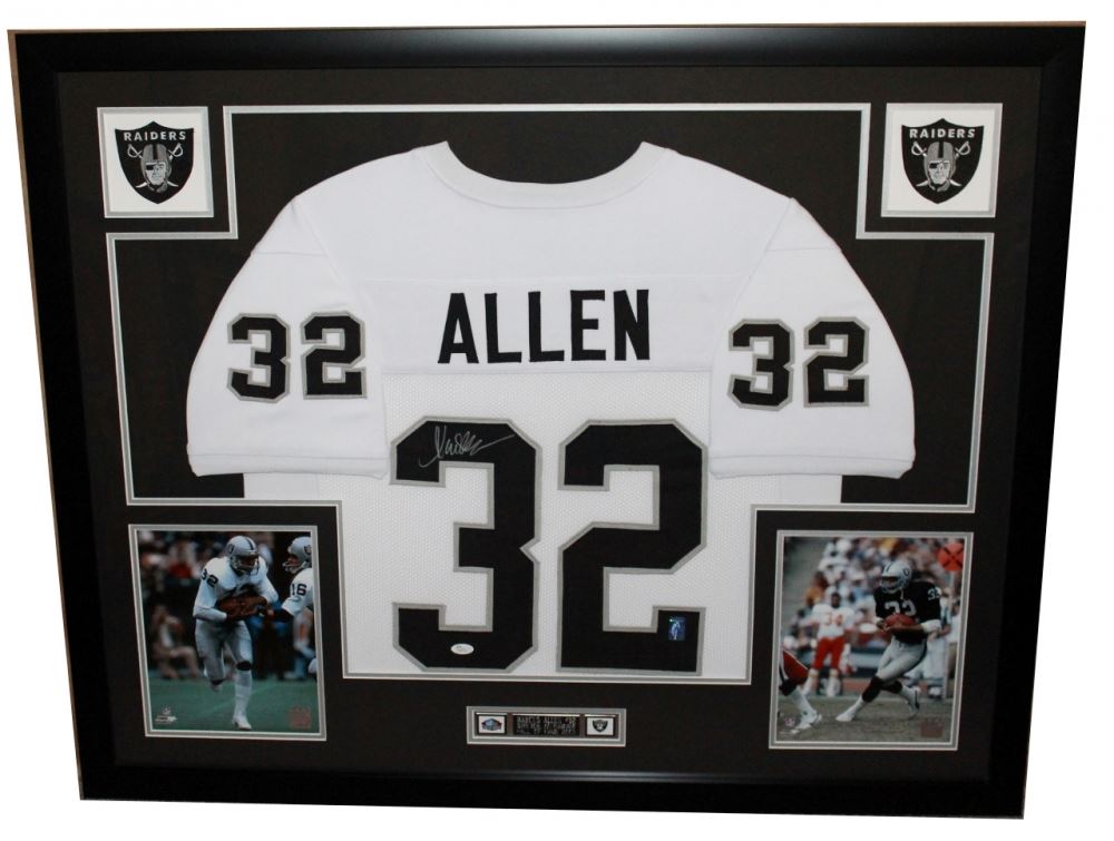 A beautifully framed autographed Marcus Allen Raiders Jersey. The autograph was certified by JSA and includes a sticker on the Jersey and a matching certificate attached to the back of the frame.Â