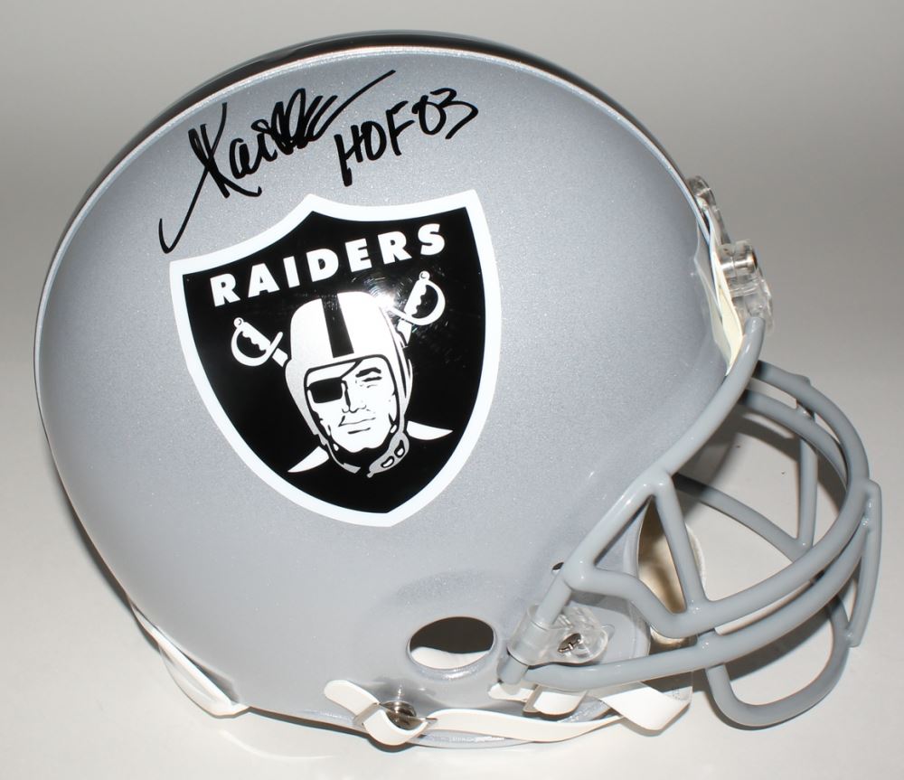 Raiders full-size authentie helmet. Hand-signed and inscribed in black felt-tip pen by Marcus Allen (Chiefs HOF).