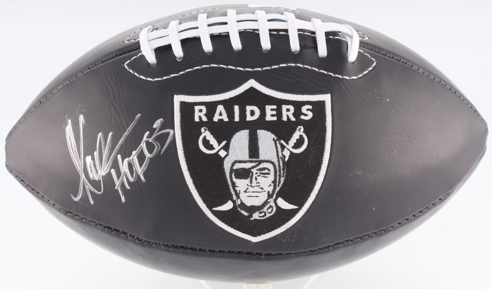 Oakland Raiders logo black leather football. Hand-signed in silver paint pen by Marcus Allen (HOF).