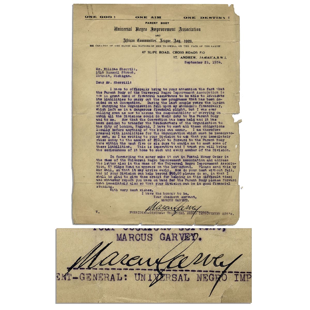 Marcus Garvey typed letter signed as President and General of the Universal Negro Improvement Association (UNIA). On UNIA stationery and dated 21 September 1934, letter to William Sherrill in Detroit, Michigan reads in part, ''the Parent Body of the Universal Negro Improvement Association is now in great need of financial assistance to be able to liquidate its liabilities to carry out the new programme that has been decided on at Convention. During the last couple years the burden of carrying the Organization fell upon my shoulders financially, which left me in a dangerous financial plight...it has been decided to transfer the headquarters...[to]...London, England...I am writing to your Division to ask that you immediately raise money to the amount of $50.00 to forward to the Parent Body...[signed] Marcus Garvey''. Fragile single-page letter measures 8.5'' x 11''. Toning, chipping to edges and a paperclip imprint to top edge. Very good condition.