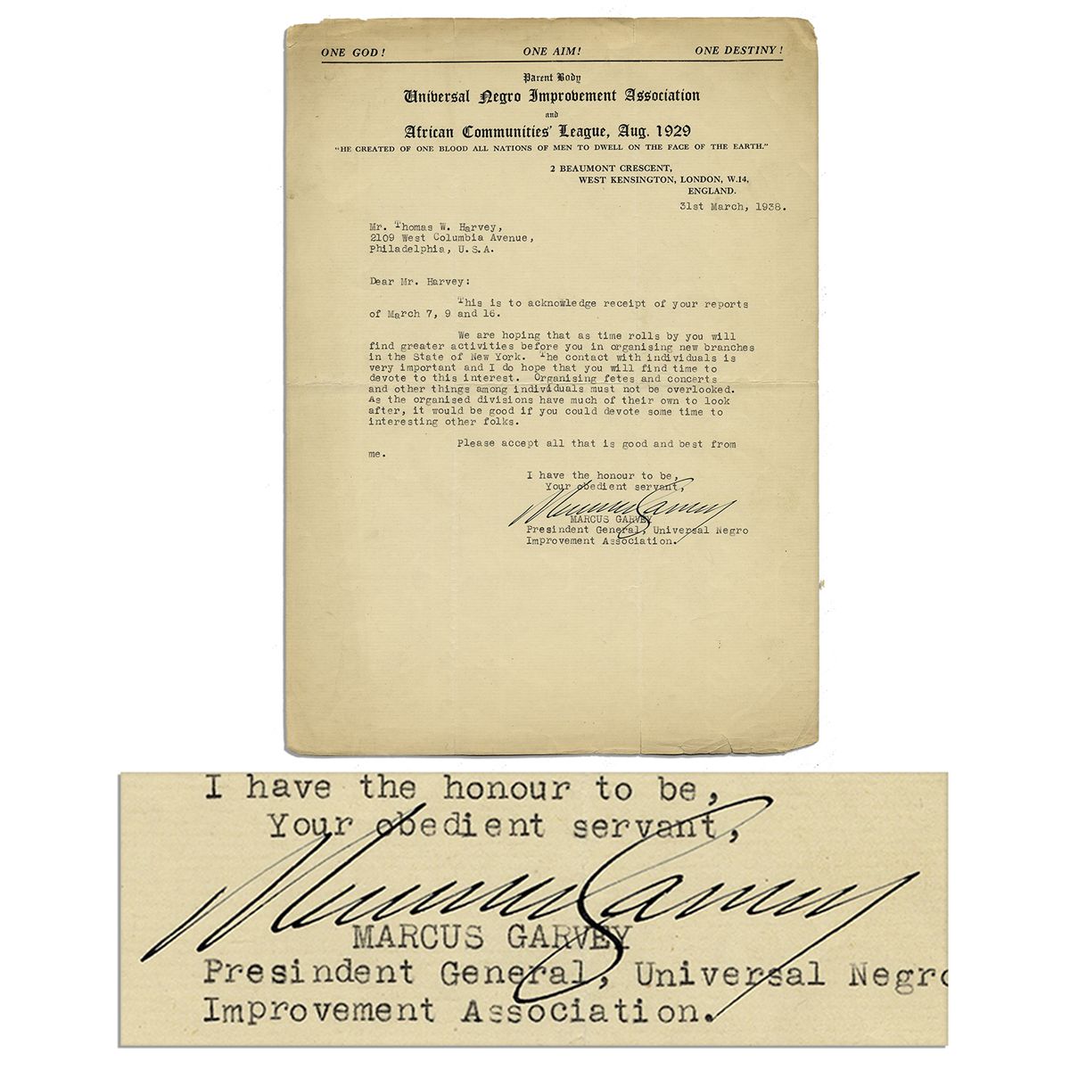 Marcus Garvey typed letter signed as President and General of the Universal Negro Improvement Association (UNIA). Letter on UNIA stationery is dated 31 March 1938. Addressed to Thomas Harvey of Philadelphia, PA, letter reads in part, ''...We are hoping as time rolls by you will find greater activities before you in organizing new branches in the state of New York. The contact with individuals is very important and I do hope that you will find time to devote to this interest. Organising fetes and concerts and other things among individuals must not be overlooked...it would be good if you could devote some time to interesting other folks...[signed] Marcus Garvey''. Single-page letter measures 8.5'' x 11.5''. Toning, creasing and small tears to delicate edges, else near fine.