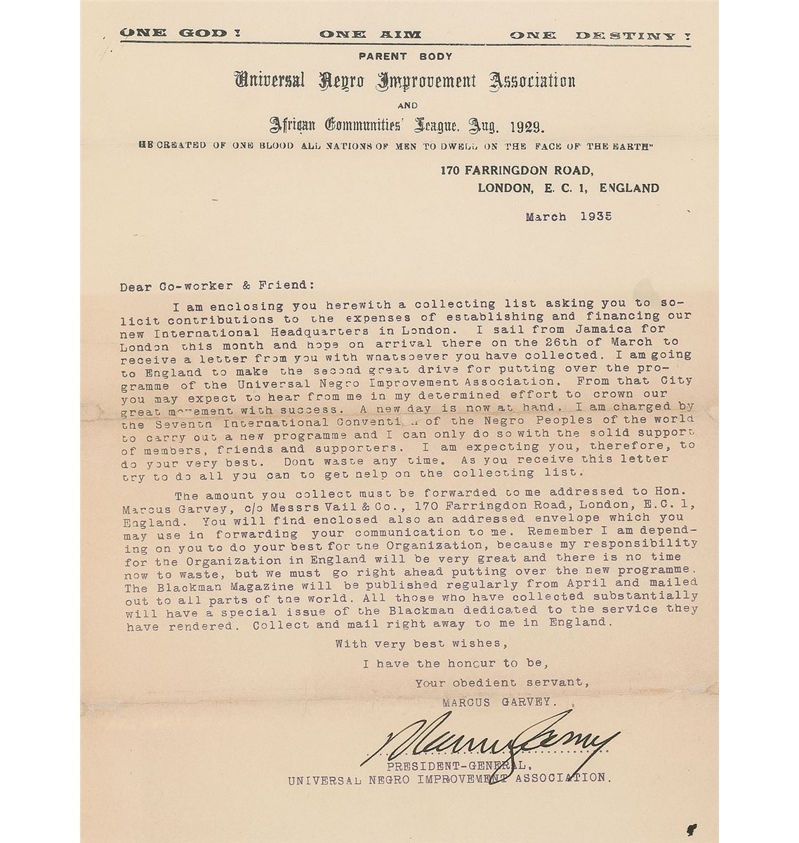 Political leader and publisher (1887–1940) who was a staunch proponent of the black nationalism and Pan-Africanism movements. TLS, one page, 8.25 x 11, Universal Negro Improvement Association letterhead, March 1935. Letter to a co-worker and friend. In part: “I am…asking you to solicit contributions to the expenses of establishing and financing our new International Headquarters in London. I sail from Jamaica for London this month…I am going to England to make the second great drive for putting over the programme of the Universal Negro Improvement Association. From that city you may expect to hear from me in my determined effort to crown our great movement with success.” Repaired partial separations to horizontal folds, otherwise fine condition. A boldly signed letter by this controversial early civil rights leader.