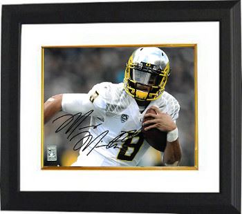 Marcus Mariota played college football at the University of Oregon and was the Ducks starting quarterback from 2012 to 2014. Mariota became the first Oregon player and Hawaii-born athlete to ever win the Heisman Trophy as a junior in 2014. He was taken second overall by the Tennessee Titans in the 2015 NFL Draft Marcus Mariota has hand signed this Oregon Ducks 8x10 Photo. Mariota Hologram and Certificate of Authenticity from Athlon Sports Collectibles. Custom White Mat and Premium Black Color Framed as shown.