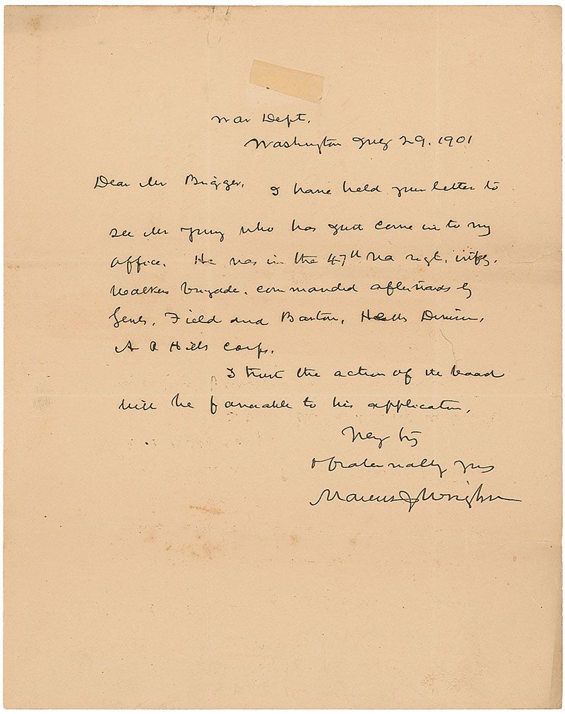 Confederate general (1831–1922) who was wounded at Shiloh and fought at Chickamauga and Missionary Ridge. He was instrumental in the publication of the War of the Rebellion: Official Records. ALS signed “Marcus J. Wright,” one page, 8 x 10, July 29, 1901. Letter of recommendation. In part: “Mr. Young…was in the 47th Va regt. infty. Walker’s Brigade, commanded afterwards by Genls. Field and Barton, Heth’s division, A. P. Hill’s Corps.” In very good condition, with intersecting folds (one vertical fold passing through a single letter of the signature), a tear to the right edge, light foxing, and piece of tape affixed to the top.
