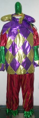 This custom Mardi Gras Jester costume was designed by Frankie Stein. Comes complete with pants, shirt, and decorative hat, all multi-colored. Ms. Stein's work has been featured on stage, television, film & print, and she successfully owns and operates "Frankie Steinz" costume shop in New York. As a freelance costume designer, she later moved her business to New York City where her many clients include ABC, Sony, Disney and HBO, and celebrities Robert De Niro, Billy Joel and Dolly Parton, to name a few. Her work has been featured in The New York Times, Time Out magazine and People Online, and has been seen on The David Letterman Show, The View, Saturday Night Live, The Rosie O'Donnell Show, and Everybody Loves Raymond, and she is credited on the major Academy Award winning film 'Eternal Sunshine of the Spotless Mind.