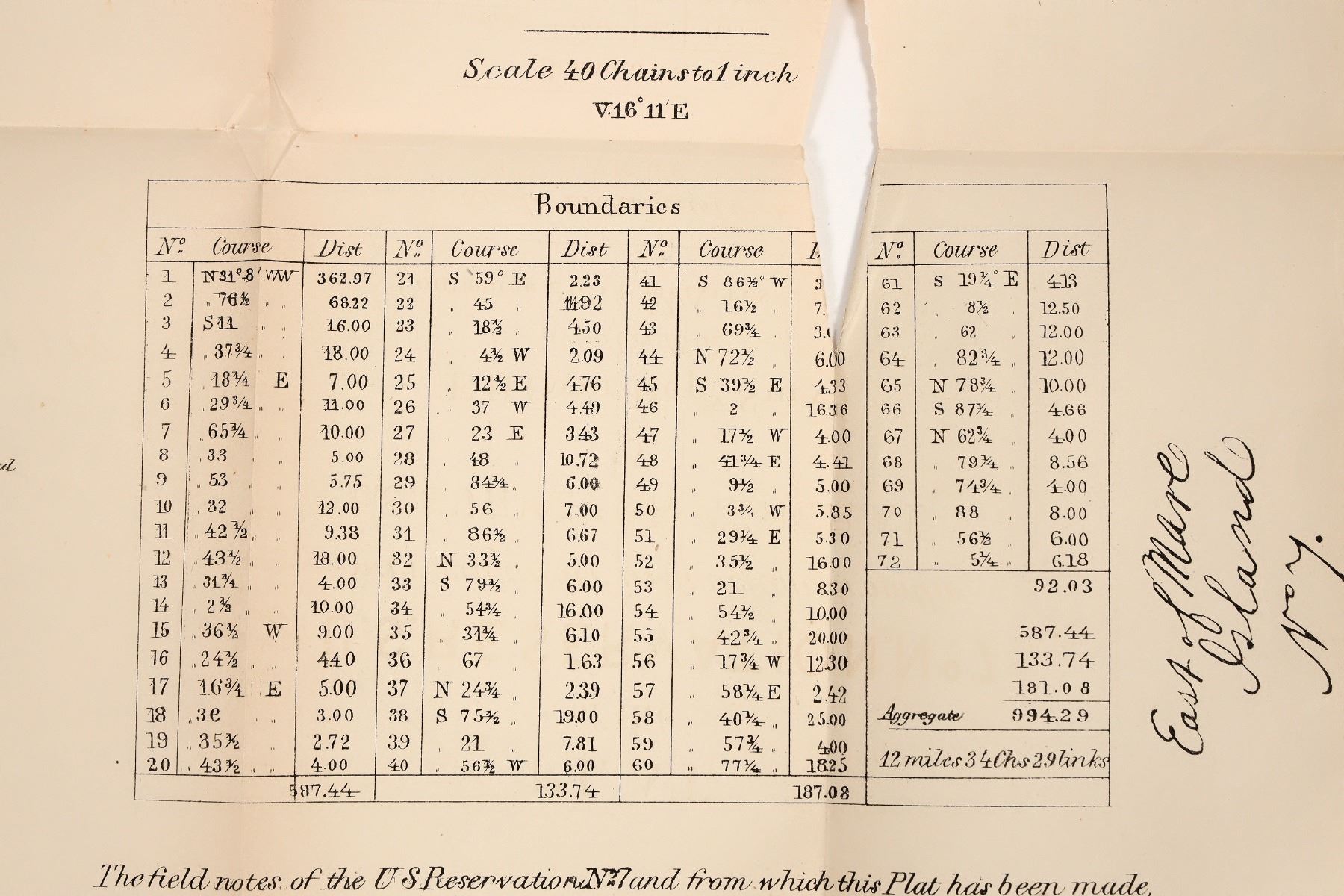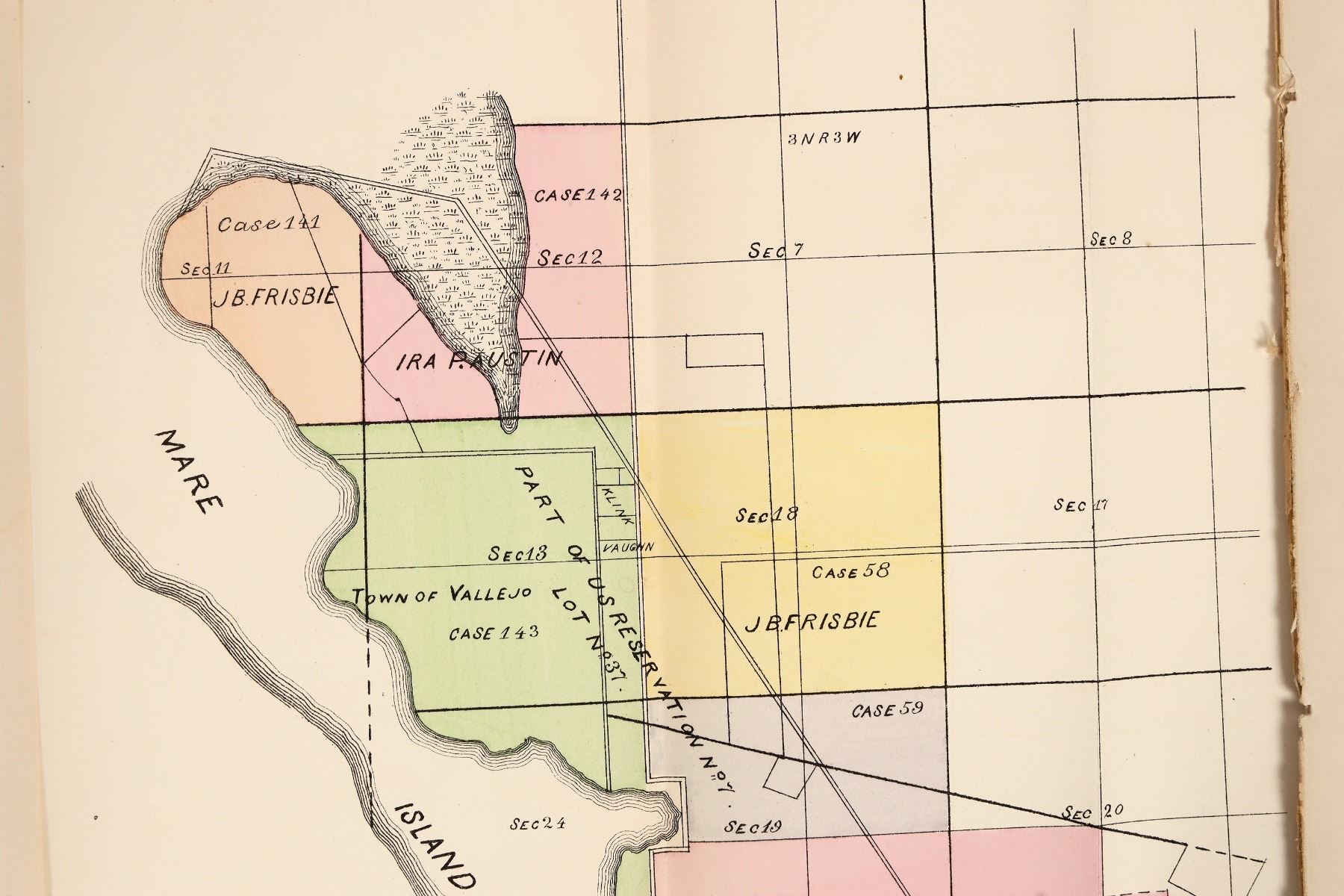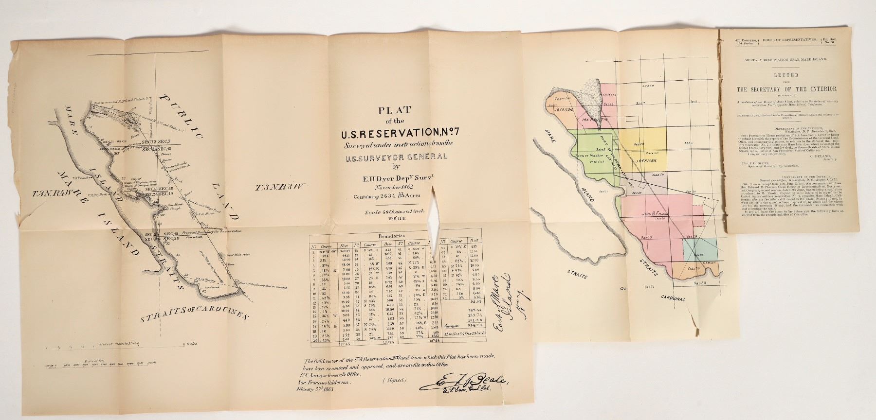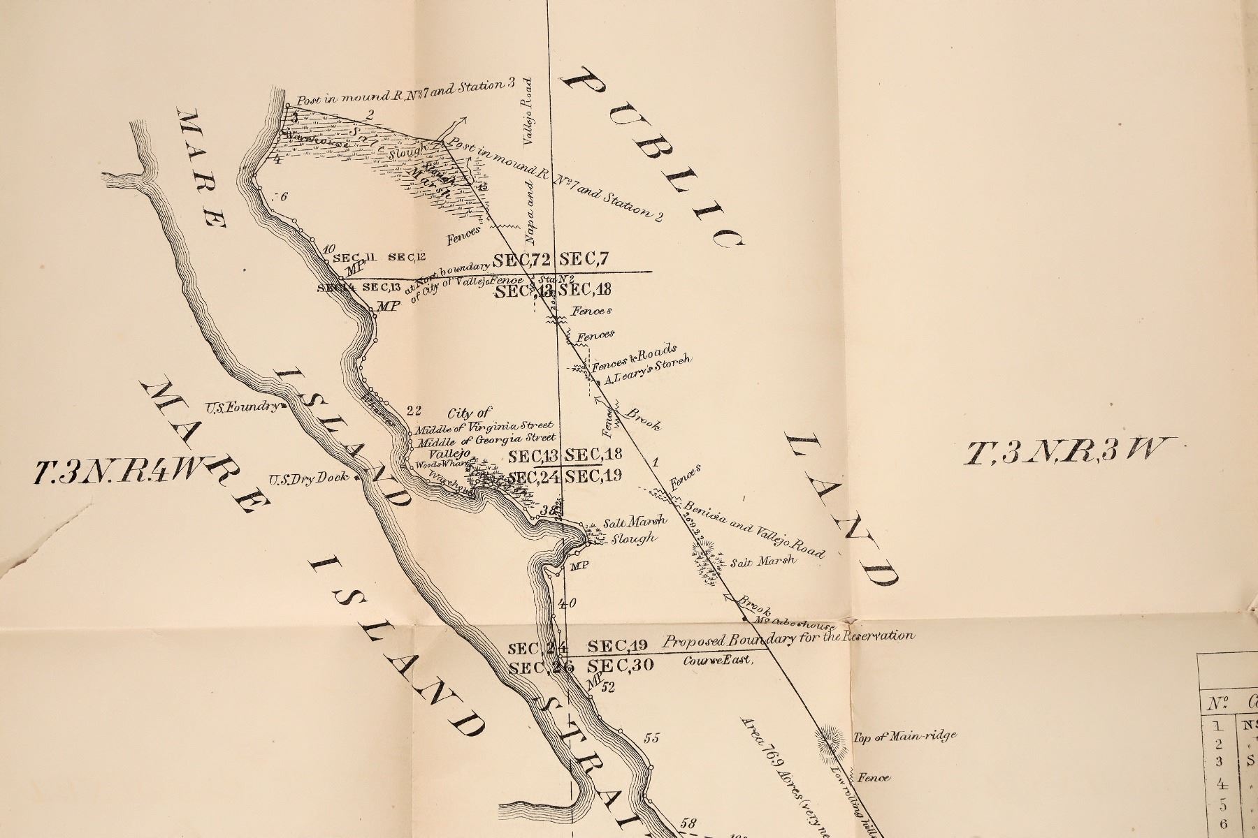 Secretary Of The Interior status report on Mare Island Reservation No. &. 42nd Congress, House of Representatives. 28 pages with two maps of the Straits and the island. It was determining whether the land is still vested with the government and determining if it was sold to individuals and if it was proper.