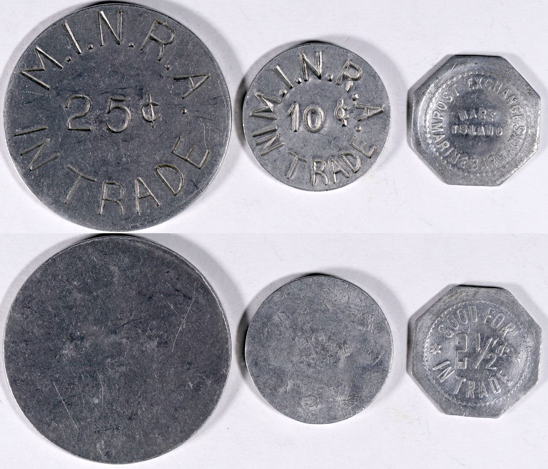 Lot of three: 1) M.I. N.R.A. / 10c / In Trade // (reverse blank); Wm, rd., 30 mm; not listed in Kappan. 2) M.I.N.R.A. / 25c / In Trade // (reverse blank); Wm, rd., 40 mm; listed as two known. 3) Post Exchange / Marine Barracks / Mare / Island // Good For / 2 1/2 c / In Trade; Wm, octagonal, 24 mm, extremely rare.