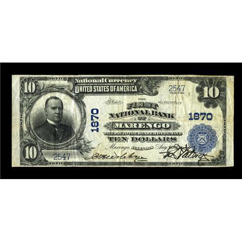 <B>Marengo, IL</B></I> - $10 1902 Plain Back Fr. 628 <B>The First NB</B></I> Ch. # 1870<BR>A most attractive piece from this very scarce McHenry County issuer. Although this bank, the only one in town, lasted until 1932, it was one of the smallest and most thinly capitalized in the state, as evidenced by its miniscule issue of both large and small notes. Pleasing <B>Fine-Very Fine,</B></I> with strong pen signatures.<BR><I>From The Lincoln Collection</B></I><BR><BR><b>Shipping:</b> Coins & Currency (<a target="_blank" href="http://www.heritageauctions.com/common/shipping.php">view shipping information</a>)