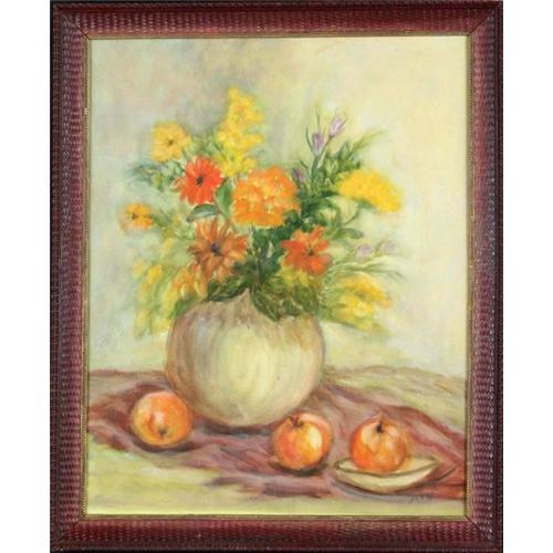 This very attractively painted picture has an impressionistic feel with just a touch of abstraction. Its flowing lines move your eyes through the paintings subtle changes in value and sharp contrasting hues. An excellent composition that is framed in a maroon, rippled frame that is accented by a gold colored inlay. This entire piece measures 18.5? x 22.5?.