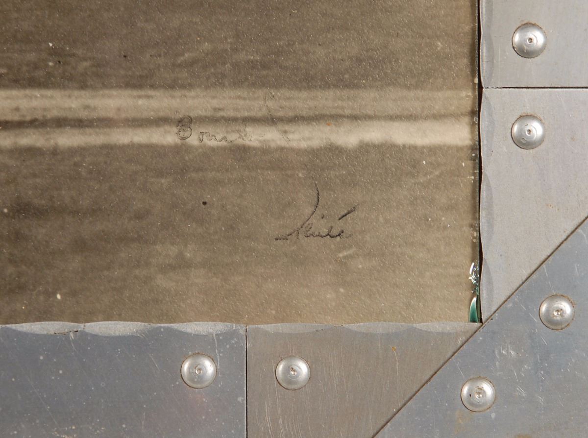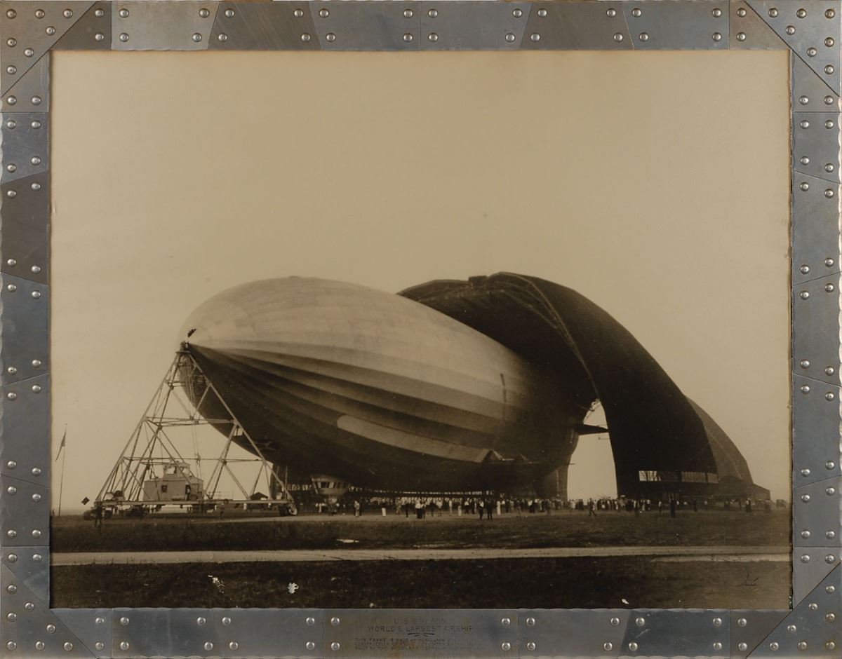 Remarkable matte-finish 23 x 17 silver gelatin photo of the rigid airship USS Akron, signed in the lower right corner in ink, “Bourke-White.” Framed in its original 26 x 20 framed, engraved along the bottom, “U.S.S. Akron, World’s Largest Airship. This frame is made of Duralumin used in girder construction of the United States Airship ‘Akron’ built by the Goodyear Zeppelin Corporation.” In fine condition, with the signature somewhat faded but generally legible.