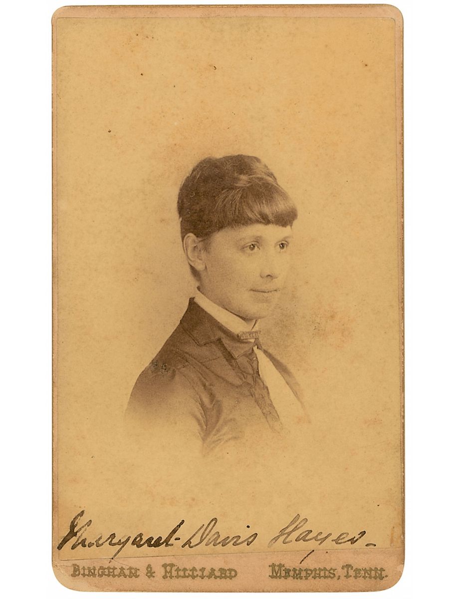 Daughter of Confederate President Jefferson Davis. Original 2.5 x 4 carte-de-visite photo by Bingham and Hilliard of Memphis, Tennessee, signed at the bottom of the image in black ink, “Margaret Davis Hayes.” In very good condition, with scattered toning and foxing to image, slight creases to bottom corner tips, and some mounting remnants to reverse.