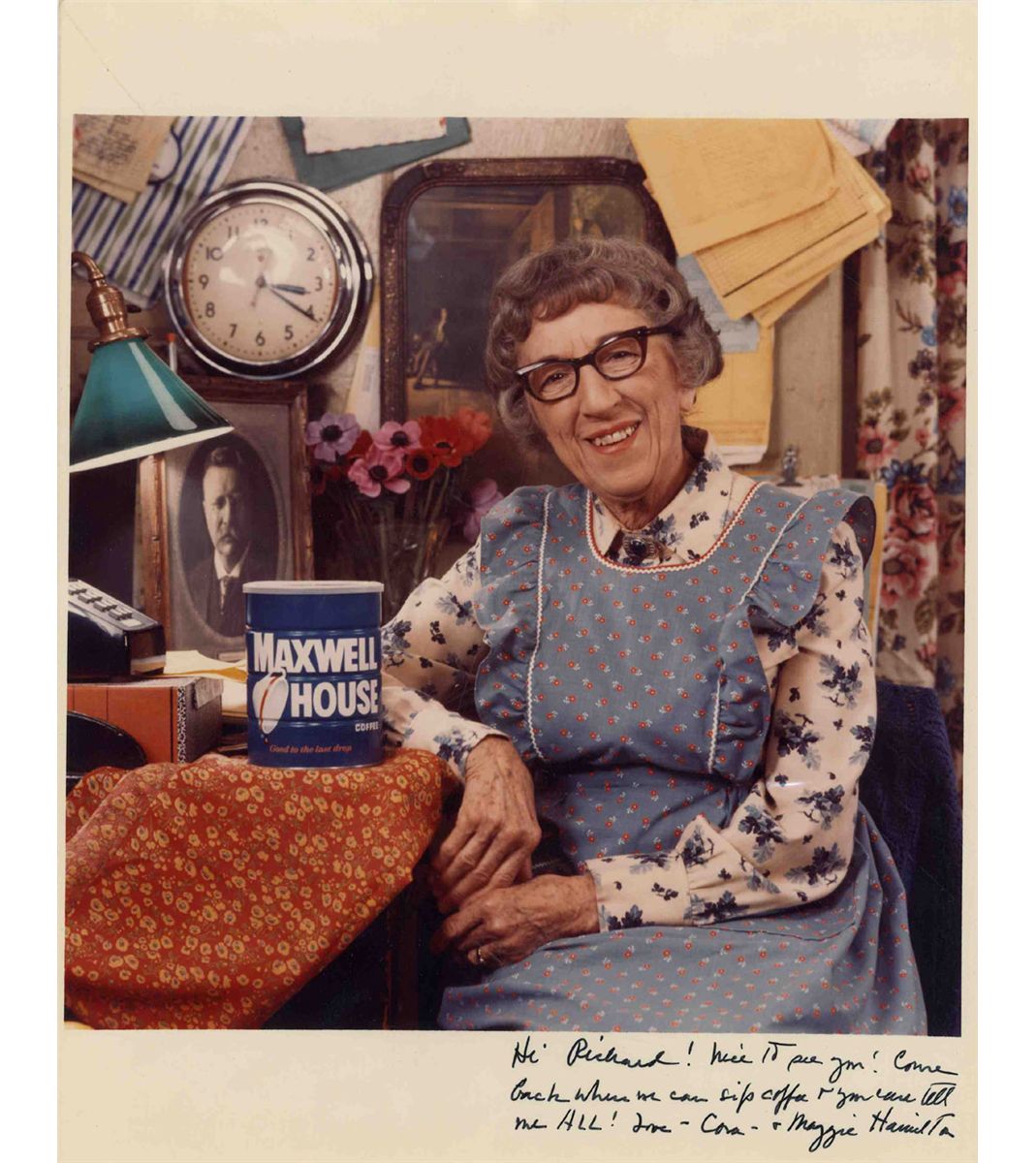 Actress Margaret Hamilton signed 8'' x 10'' color photo. Signed and inscribed along bottom in black marker, ''Hi Richard! Nice to see you! Come back when we can sip coffee & you can tell me ALL!...Maggie Hamilton''. Minor toning, else fine condition.