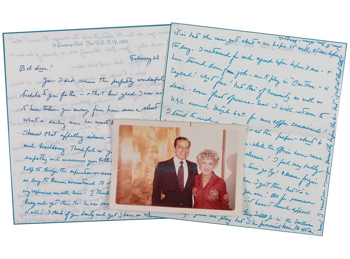 ALS signed “Maggie,” two pages both sides, 6.5 x 7.25, personal letterhead, February 23. Letter to theater critic Robert E. White updating him on the health of her sister and her career. In part: “I returned for work agreed upon before X-mas—& have turned down four jobs—one to play in Our Town in England! What fun! But this of necessity as well as desire—come first of course. Now I will return to NYC around March 6 or 7 for more coffee commercials! I tried to reach you at home or at the paper—about 6 times—& home didn’t answer—While the office never came upon quiet! Always Peace so elusive.” In fine condition. Accompanied by the original mailing envelope, as well as a candid photo of Hamilton and James-Allen Smith posing together before her one-woman show in 1974.