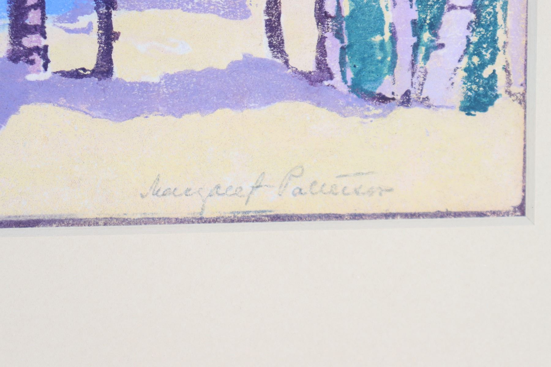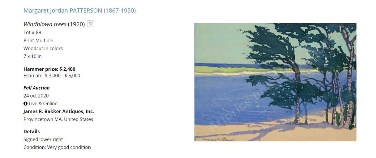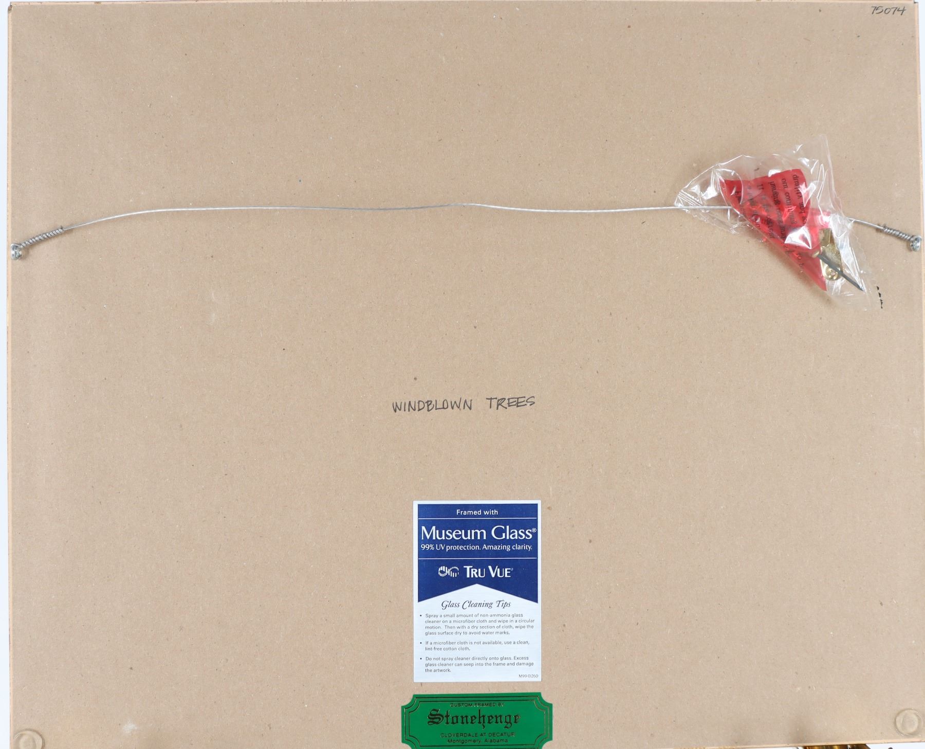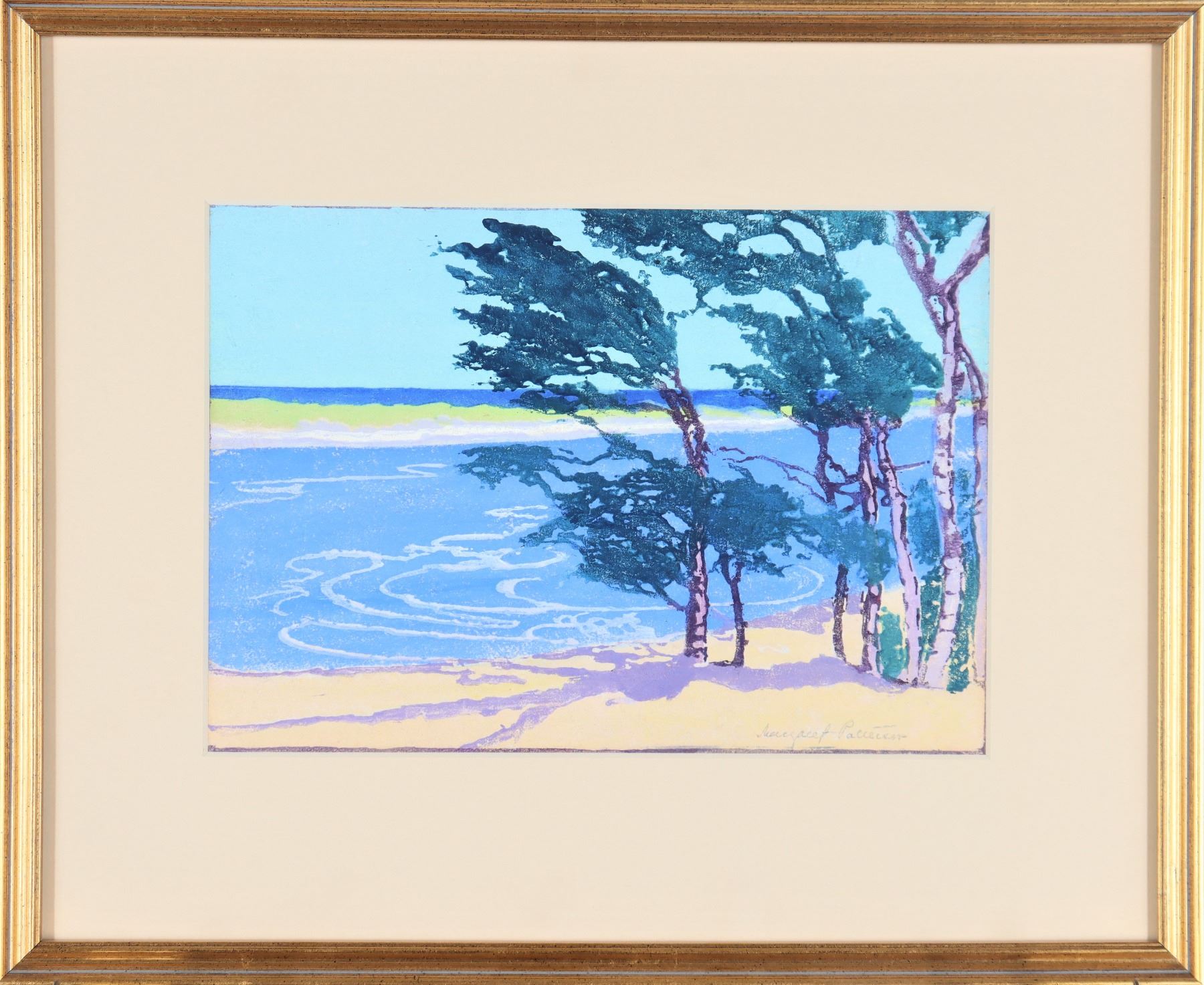 Titled 'Windblown Trees', color woodblock print on paper, signed lower right. Matted and framed. Patterson was active/lived in Massachusetts.