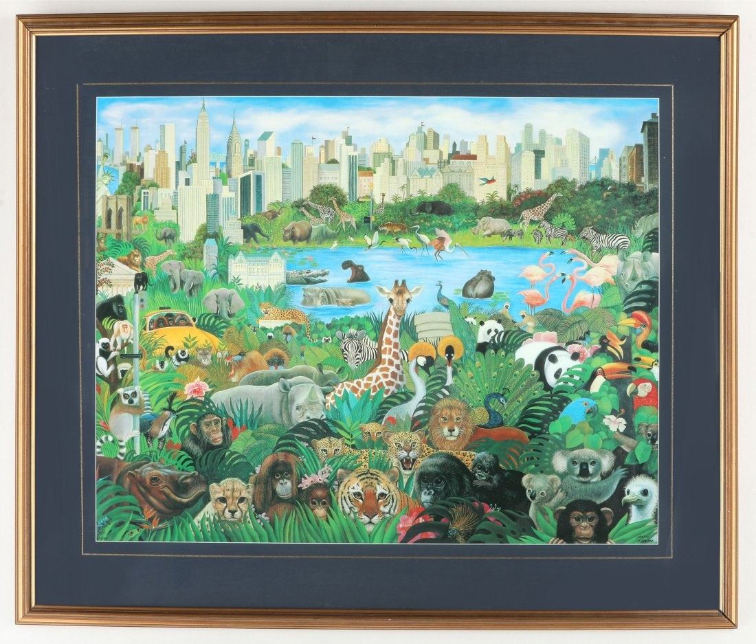 Margaret Keane's "It's a Jungle Out There" limited edition print, signed and numbered 67/150. This piece has been professionally matted, and custom framed under glass. Image- 26 3/4" x 33 1/2". Frame- 37" x 43 3/4".