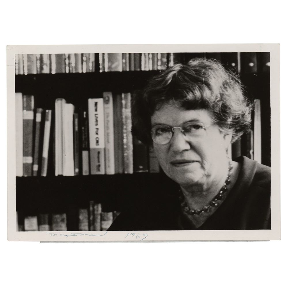 Glossy 7 x 5 close-up photo of Mead in her library, signed in the lower border in blue ballpoint, "Margaret Mead, 1969." Reverse bears "A Kodak Paper" watermarks, a photo credit to Black Star, and an address stamp for Mead at The American Museum of National History in New York. In fine condition.