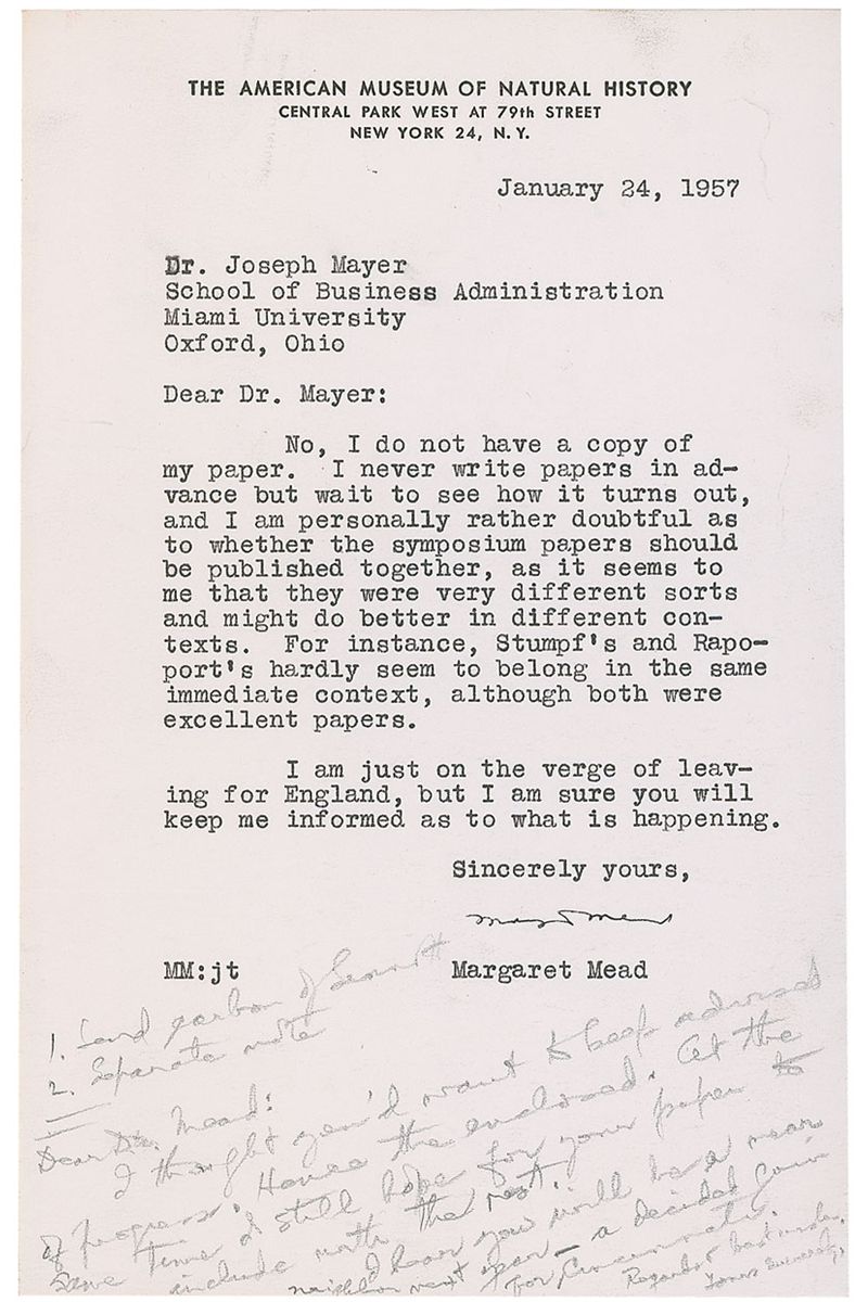 TLS, one page, 5.5 x 8.5, American Museum of Natural History letterhead, January 24, 1957. Letter to Joseph Mayer at Miami University. In part: “I never write papers in advance but wait to see how it turns out, and I am personally rather doubtful as to whether the symposium papers should be published together, as it seems to me that they were very different sorts and might do better in different contexts.” A response to Mead is written in pencil in the lower blank portion of the page. In fine condition, with some scattered light soiling.