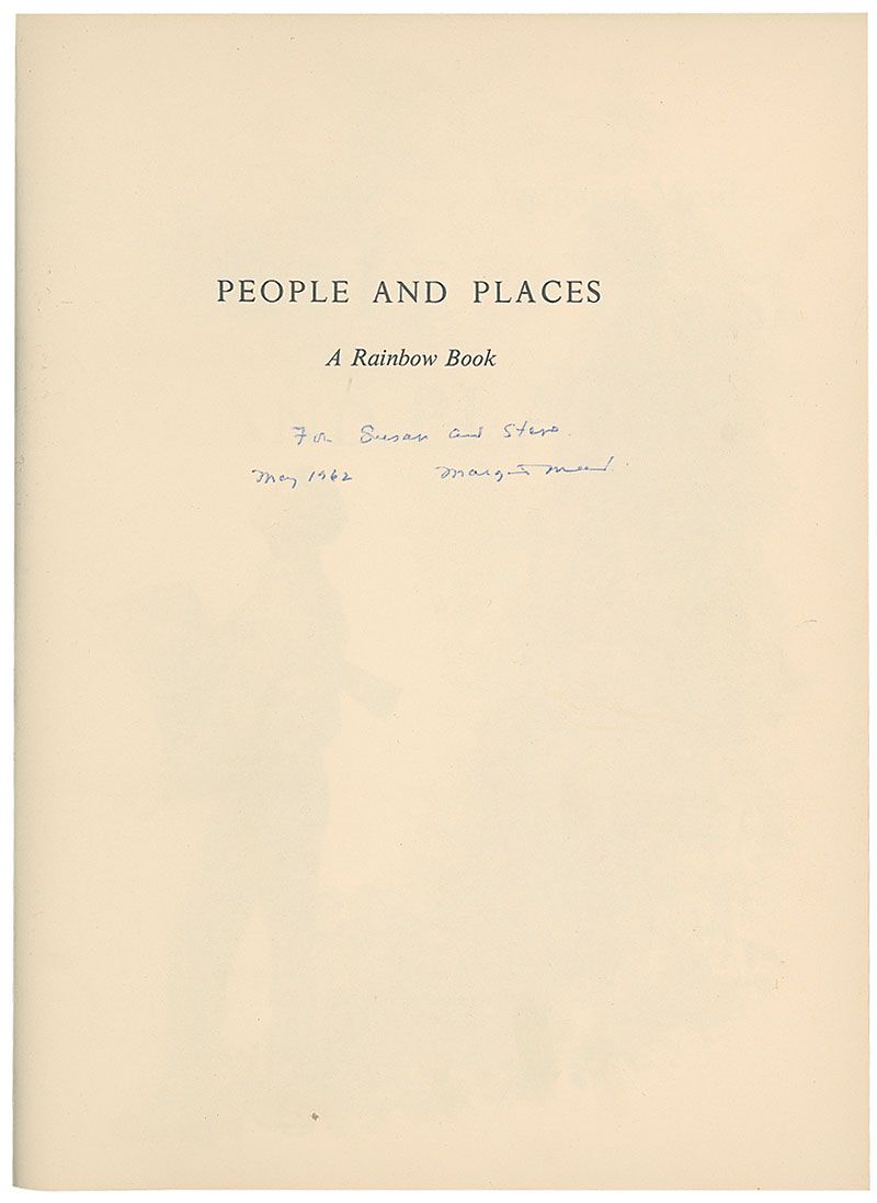 Controversial cultural anthropologist (1901–1978). Signed book: People and Places. First edition. Cleveland: World Publishing Company, 1959. Hardcover with dust jacket, 8.5 x 11.25, 318 pages. Signed and inscribed on the half-title page, “For Susan and Steve, Margaret Mead, May 1962.” In fine condition.