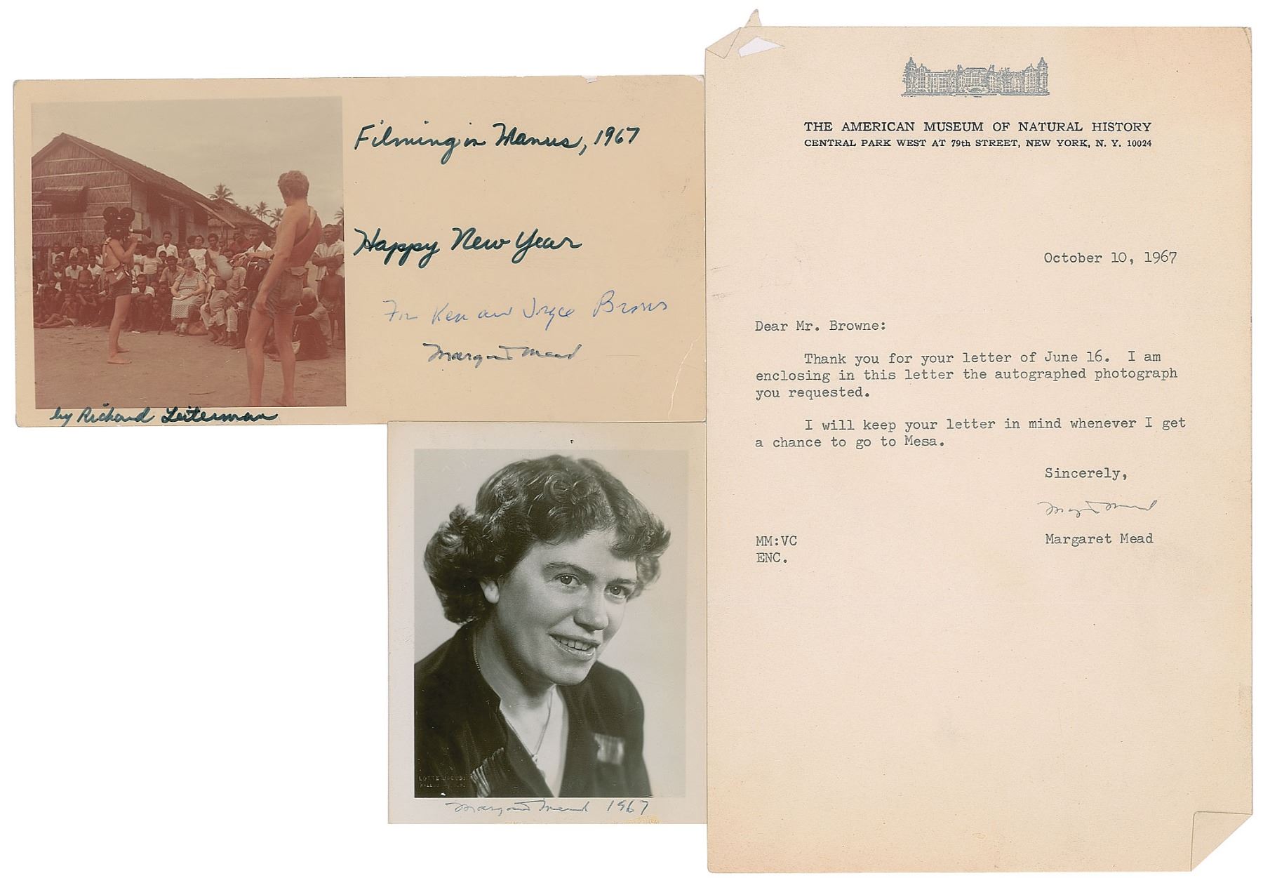 Cultural anthropologist (1901–1978) who featured frequently as an author and speaker in the mass media during the 1960s and 1970s. Her reports detailing the attitudes towards sex in South Pacific and Southeast Asian traditional cultures influenced the 1960s sexual revolution. Three items: a TLS, one page, 5.5 x 8.5, The American Museum of Natural History letterhead, October 10, 1967, in part: "Thank you for your letter of June 16. I am enclosing in this letter the autographed photograph you requested"; a glossy 3.25 x 4 photo of Margaret Mead, signed in the lower border in black ballpoint and dated "1967"; and a color glossy 7 x 3.5 postcard photo of Mead during a film shoot on the island of Manus, signed in black felt tip, "Filming in Manus, 1967, Happy New Year, Margaret Mead," who credits the photo to Richard Leiterman; the photo is inscribed in another hand. In overall very good to fine condition, with some light creases and postal impressions. Accompanied by three transmittal letters.