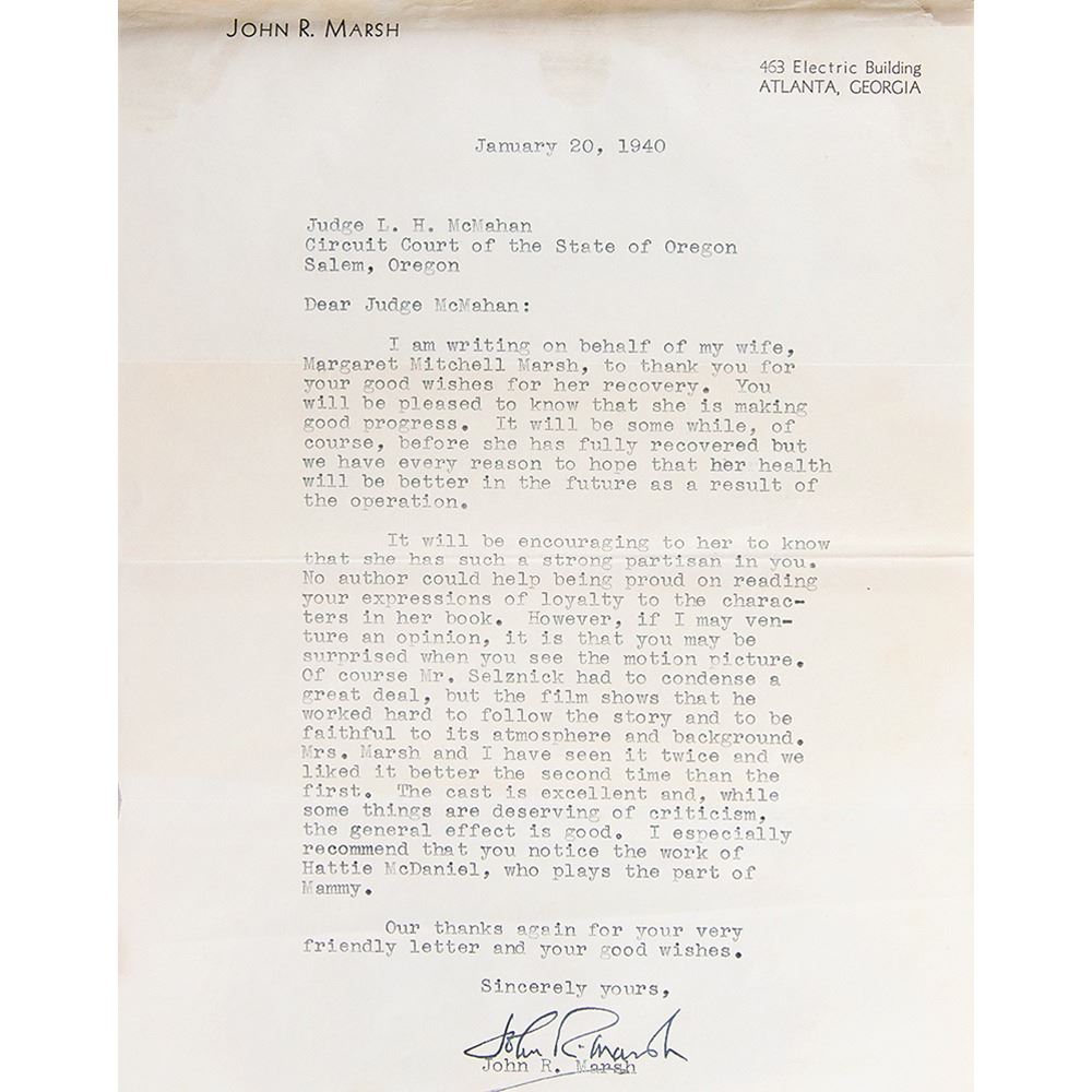 Also tipped in is a January 20, 1940, letter from Mitchell’s husband John Marsh, sending news on his wife’s recent successful operation (removal of abdominal adhesions) and making mention of the film adaptation of Gone With the Wind, which had been released a month earlier: “Mr. Selznick had to condense a great deal, but the film shows that he worked hard to follow the story and to be faithful to its atmosphere and background. Mrs. Marsh and I have seen it twice and we liked it better the second time than the first. The cast is excellent and, while some things are deserving of criticism, the general effect is good. I especially recommend that you notice the work of Hattie McDaniel, who plays the part of Mammy.” For her performance, McDaniel won the Academy Award for Best Supporting Actress, thus becoming the first African American to win an Oscar. In overall fine condition, with expected folds and some scattered stains or wear.