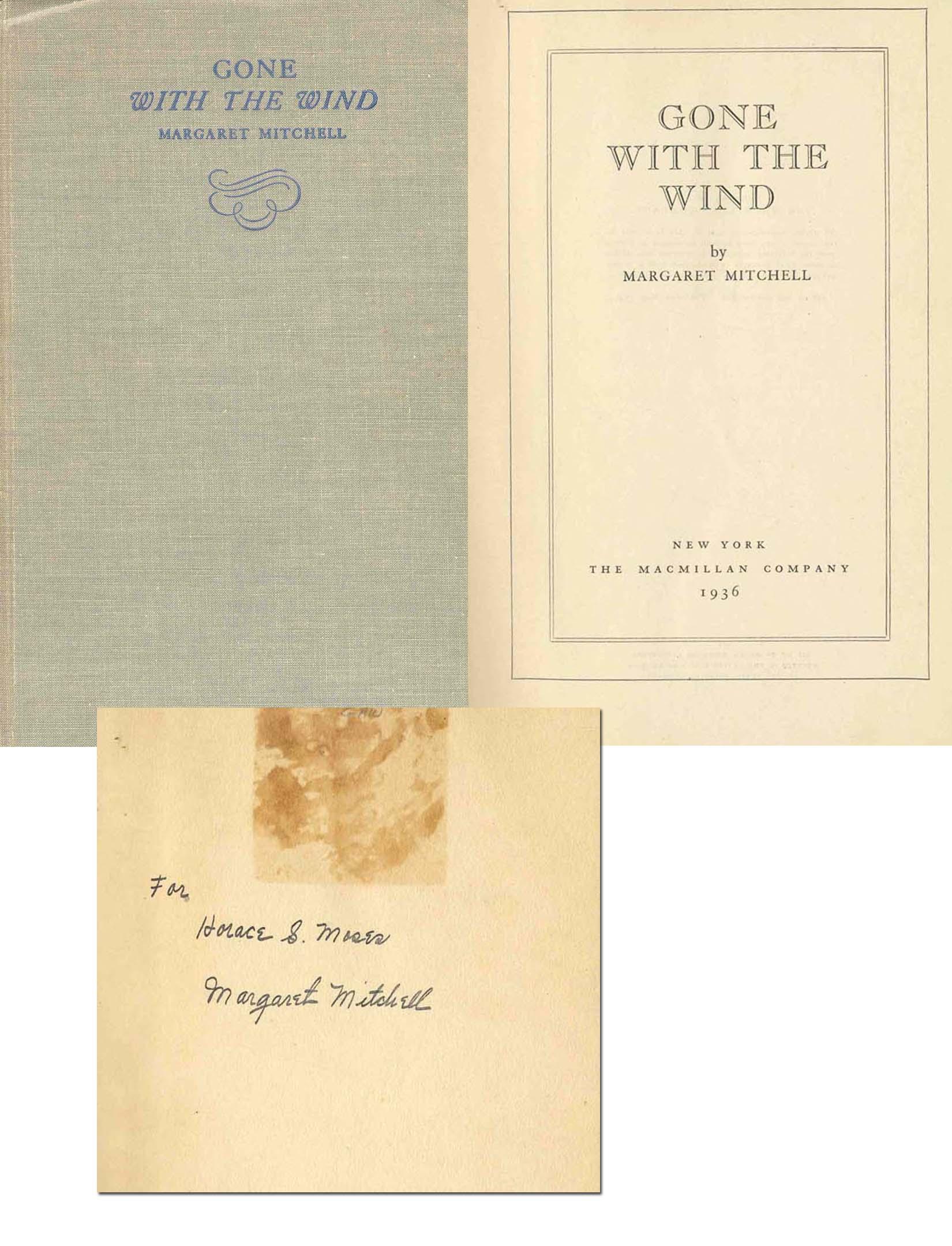First edition “Gone with the Wind” signed by Margaret Mitchell. New York: MacMillan Company: 1936. Signed in black ink on the front free endpaper, “For Horace S. Moses / Margaret Mitchell.” Without dustjacket. General shelf wear and what appears to be toned tape residue to the inscription page. Lovely book in very good condition.